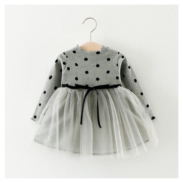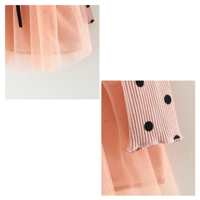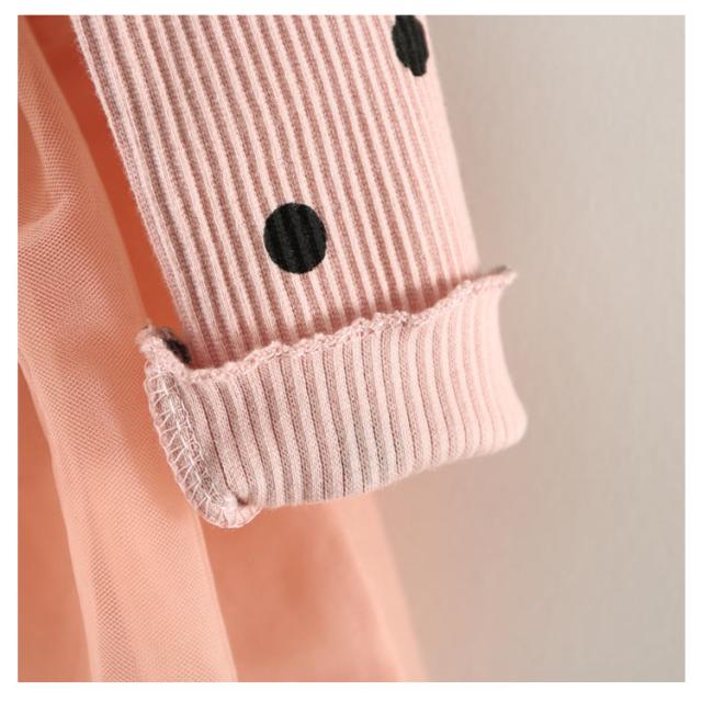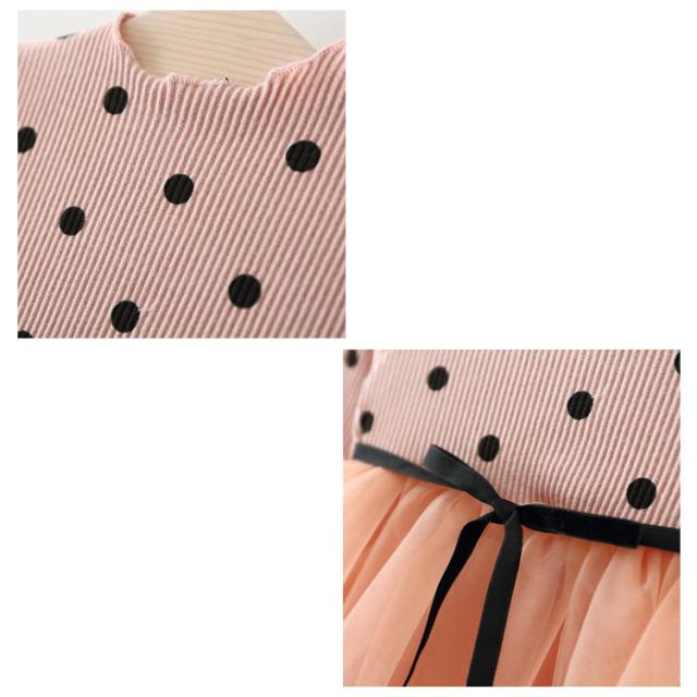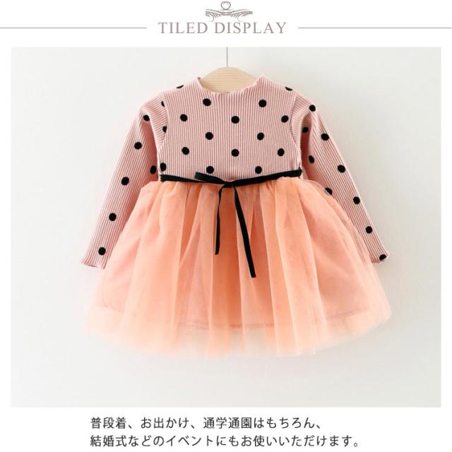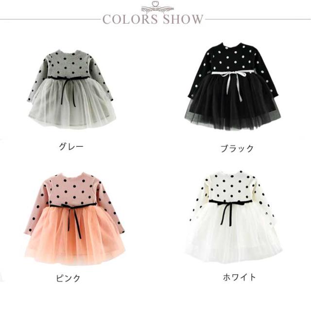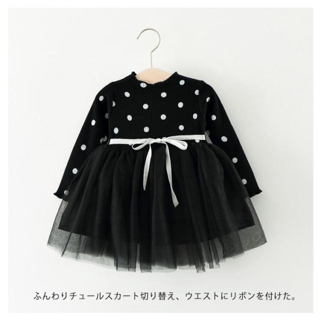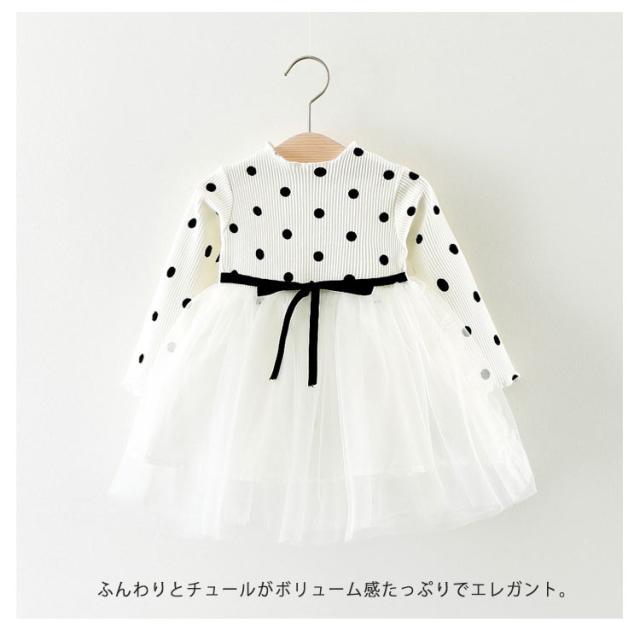 ベビー ニットワンピース キッズ ふんわりチュールスカート切り替え ドレス 女の子 子供服 赤ちゃん 女児 長袖 秋冬 春 コットン かわいい おしゃれ チュチュ フリル リボン 水玉 ホワイト ピンク グレー ブラック