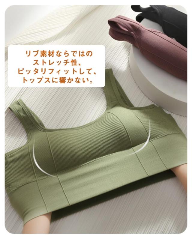 | リブ生地で下着っぽくならず、1枚ですっきり着こなせる。 リブ素材ならではのストレッチ性、ピッタリフィットして、トップスに響かない。 スクエアネックがスポーティな印象に、ヘルシーに魅せる。 太めの肩紐で肩が痛くなりにくく、長時間着用しても楽な着心地。 ノンワイヤーなので日中はもちろん、 おうち時間やリラックスタイムにも◎ ヨガ、フィットネスなどのスポーツブラとしてもおすすめ! | |