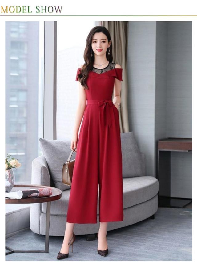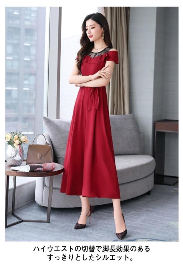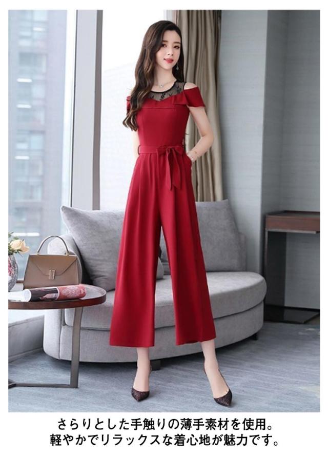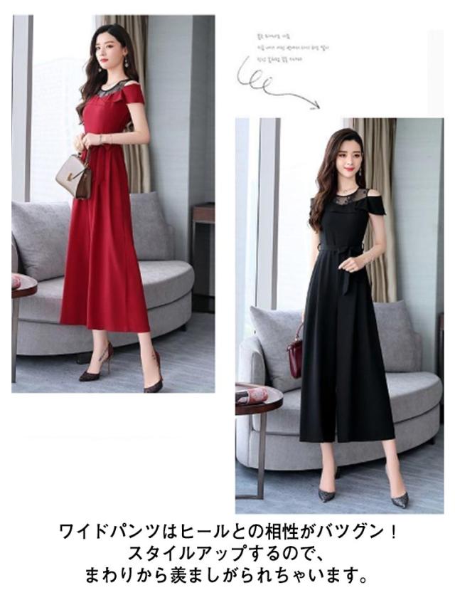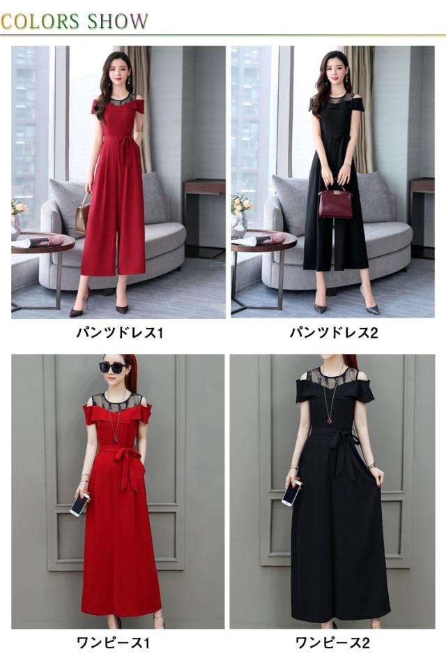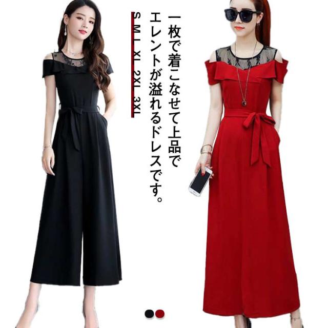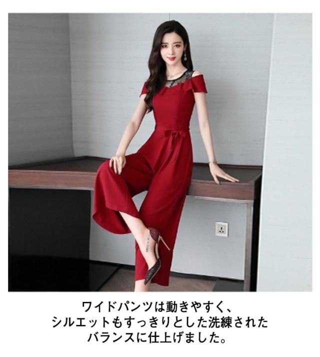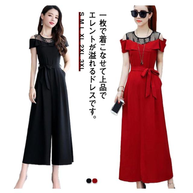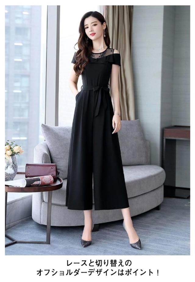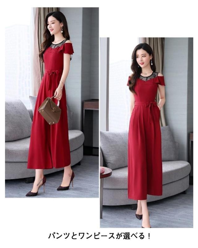 M 結婚式 フォーマル 切り替え レース パンツドレス オフショルダー オールインワン 九分丈 ワイドパンツ ゆったり 女子会 食事会 ワンピースとパンツが選べる!パーティードレス 結婚式 S 着?せ L XL ワンピース