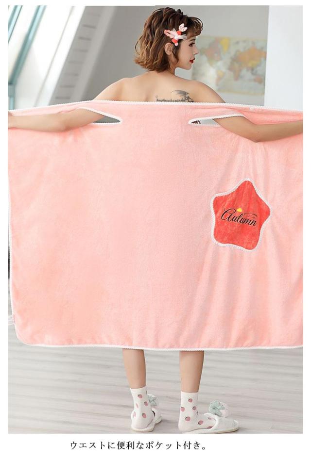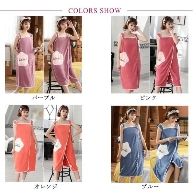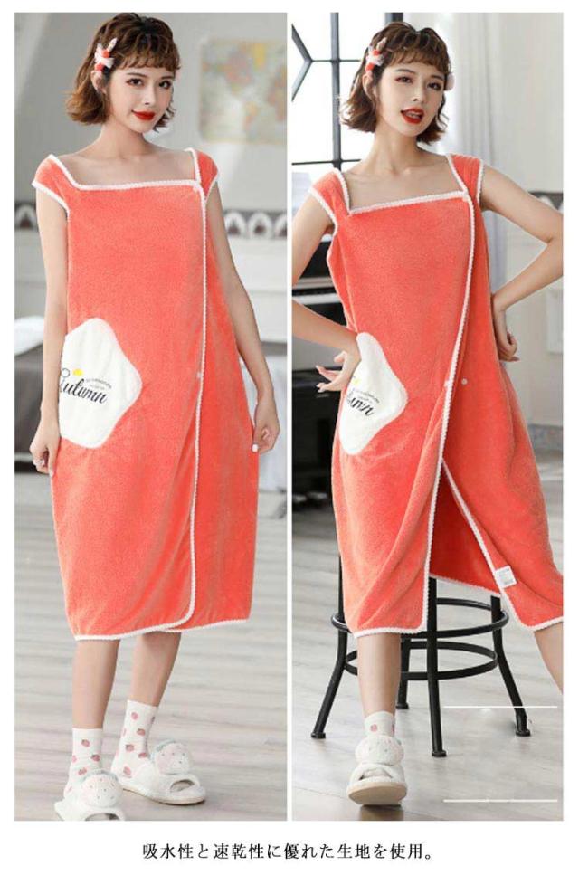 | ササッと羽織るだけで可愛いタオルバスローブ。 お風呂上がりにサッと着るだけで快適な着るバスタオル。 バスタオルに両手を通してフロントホックを留めるだけ♪ 吸水性と速乾性に優れた生地を使用。 ふんわりと柔らかく、気持ちの良い肌触りが魅力的! ウエストに便利なポケット付き。 | |