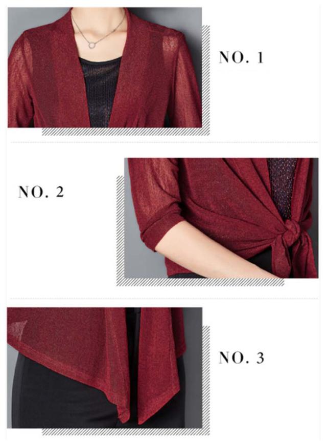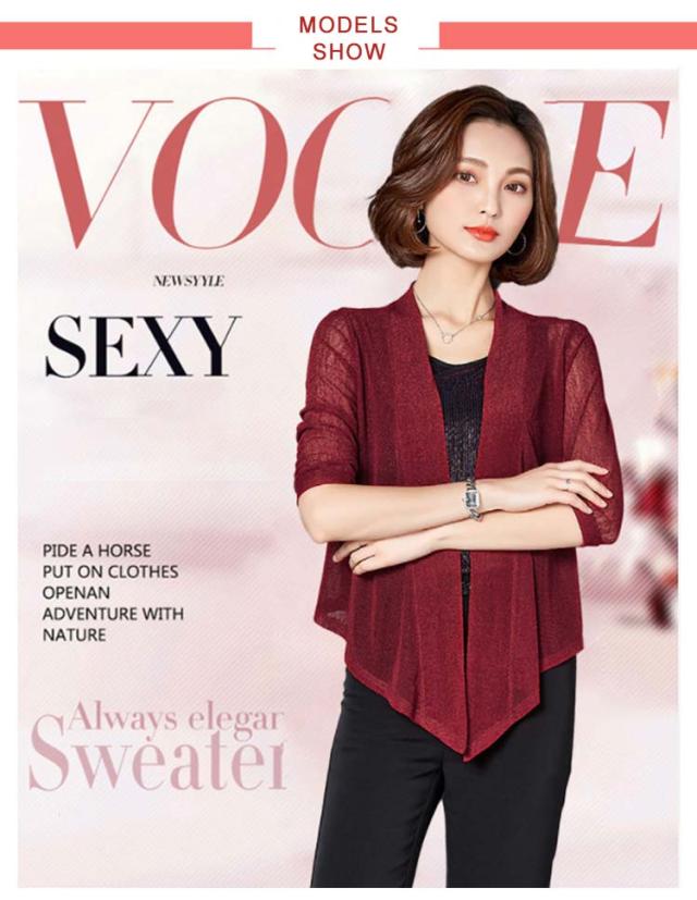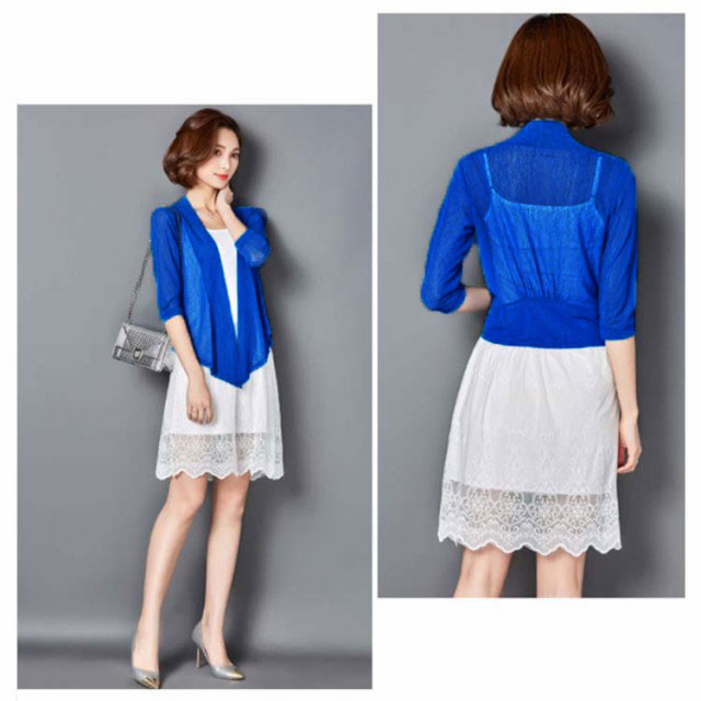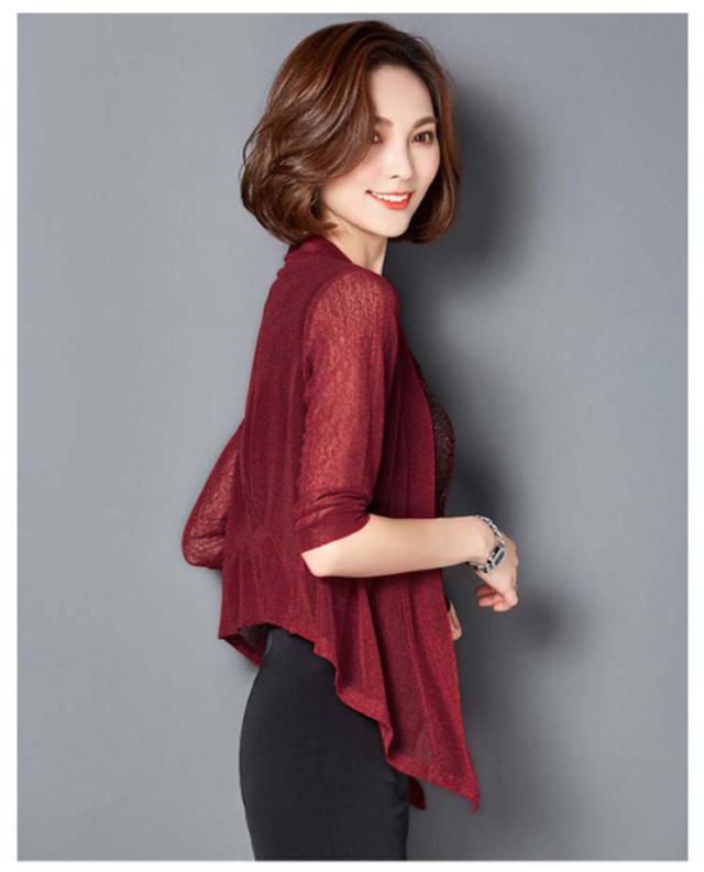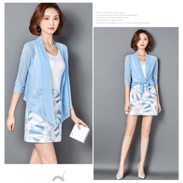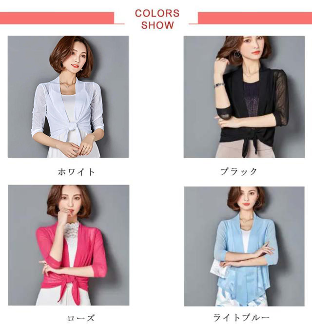 | 涼しげなシャリ感とストレッチ性のある薄手のサマーニット素材。 透け感のあるシースルー素材。 夏のUV対策や冷房対策におススメ! ドレープデザインなので、上品にそのまま羽織ってフォーマルでも。 裾を前で結んでボレロにして、カジュアルでも。 ショート丈でかさ張らないので、一枚持っていると便利なアイテム。 | |