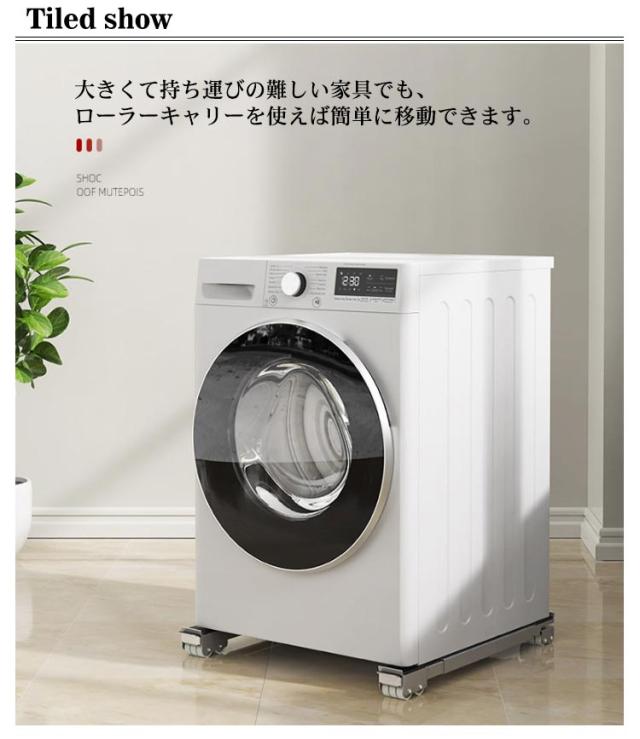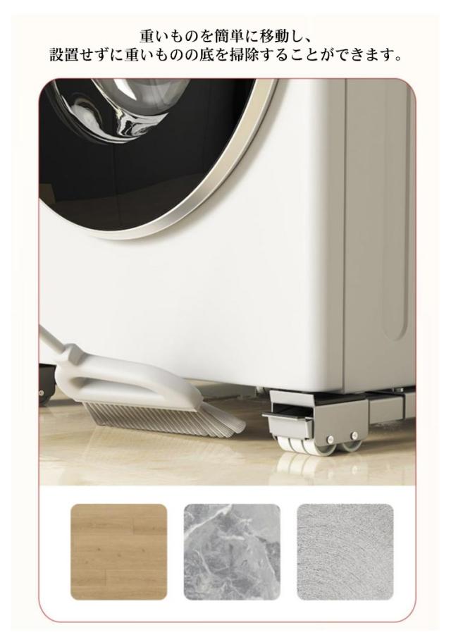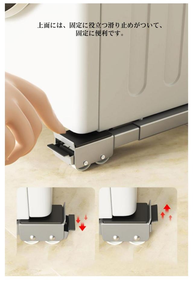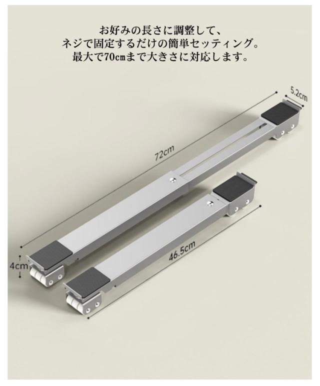 | 洗濯機伸縮式置き台2個セット。 大型家具・大型家電の移動に! 厚みも約4cmですので、高さもあまり変わらずに、ご使用できます。 お好みの長さに調整して、ネジで固定するだけの簡単セッティング。最大で70cmまで大きさに対応します。 大きくて持ち運びの難しい家具でも、ローラーキャリーを使えば簡単に移動できます。 上面には、固定に役立つ滑り止めがついて、固定に便利です。 重いものを簡単に移動し、設置せずに重いものの底を掃除することができます。 床置き器具の高さを上げるポータブル洗濯機、冷蔵庫、ミニ冷蔵庫、ポータブル乾燥機、冷凍庫に最適です。 | |