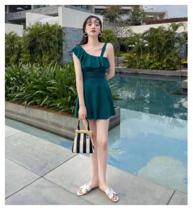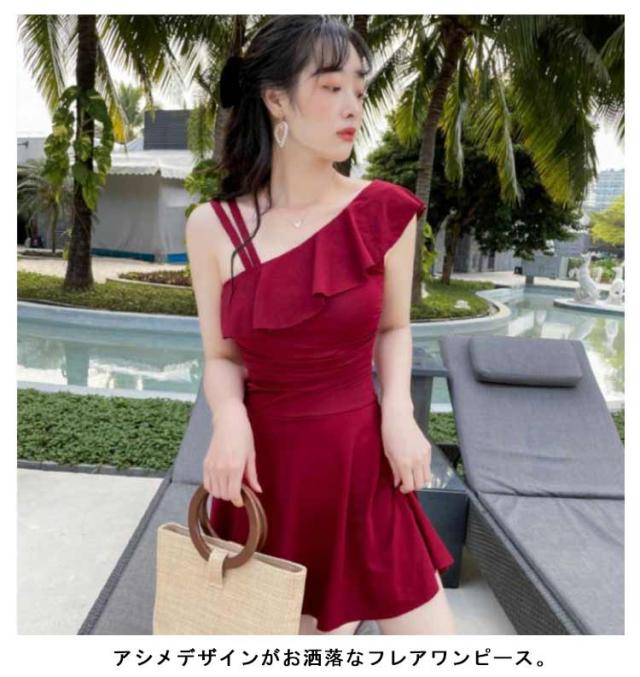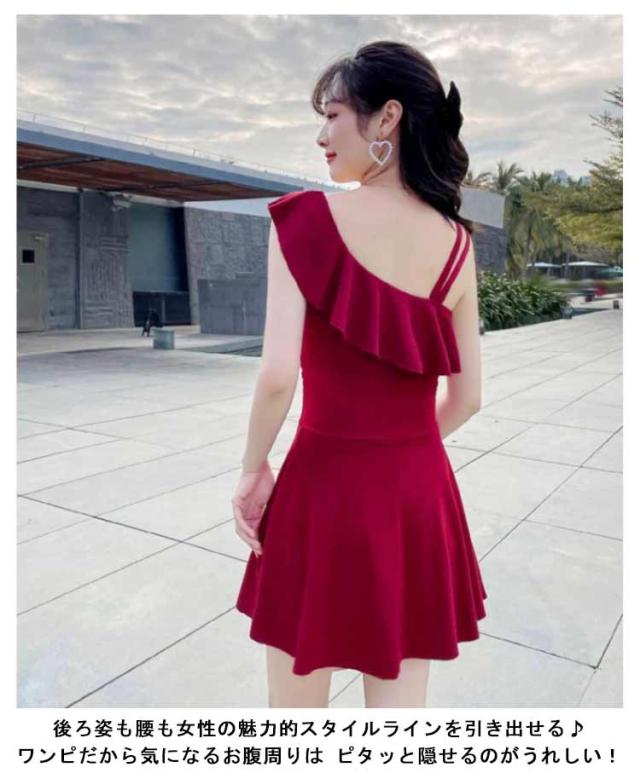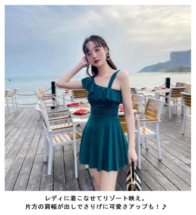 おしゃれ オールインワン レディース かわいい 黒 水着 パッド一体型 送料無料 フリル 肩出し アシメ ママ水着 無地 ガーリー ハイウエスト 脚長効果 フリルヘム Aライン ワンピース カバーアップ オトナ女子 ワンショルダー