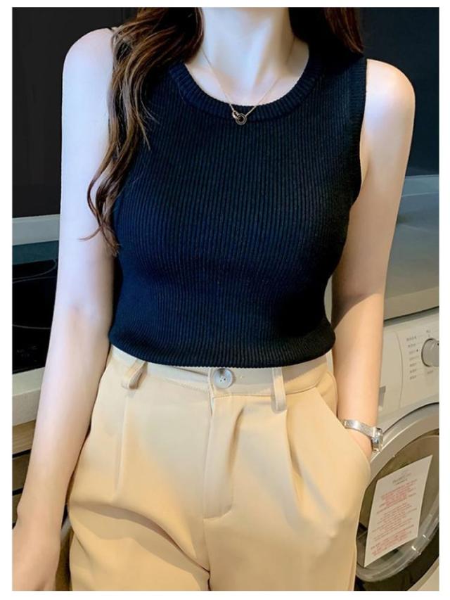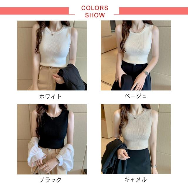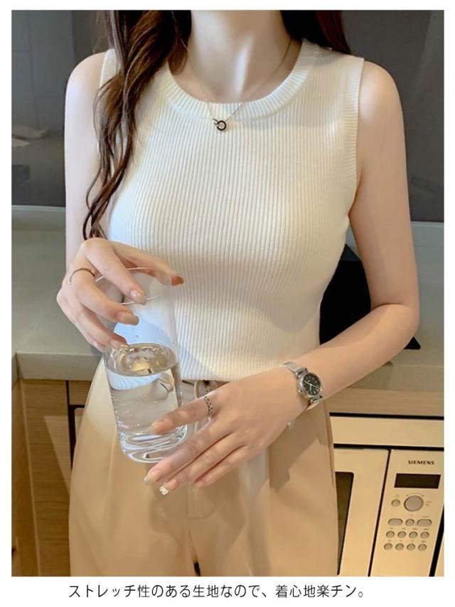 カットソー タンクトップ クルーネック ニット トップス 伸縮性 夏物 送料無料 セーター ノースリーブ リブニット サマーニット ストレッチ レディース セクシー シンプル リブ編み 仕事着 レディース