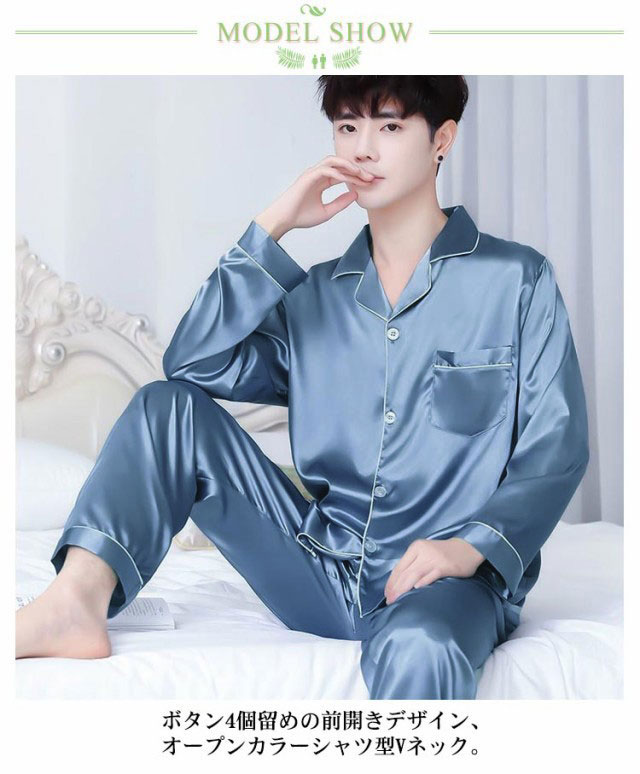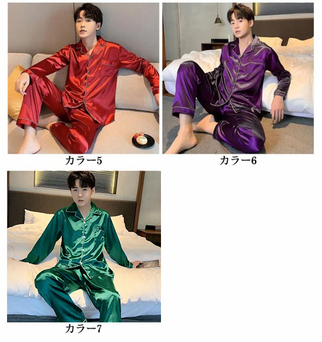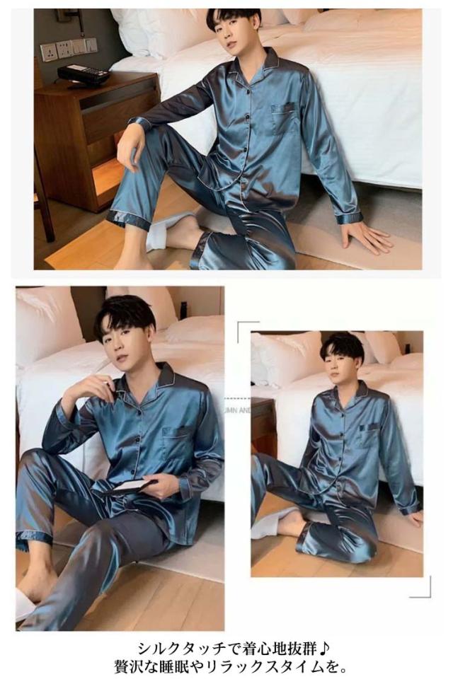 シルクタッチ ルームウェア サテンパジャマ メンズ ルームウェア 上下セット 長袖 前開き ルームウェア 光沢 ナイトウェア パジャマ パジャマ シャツパジャマ 長袖 シャツ ロングパンツ 上下セット 部屋着