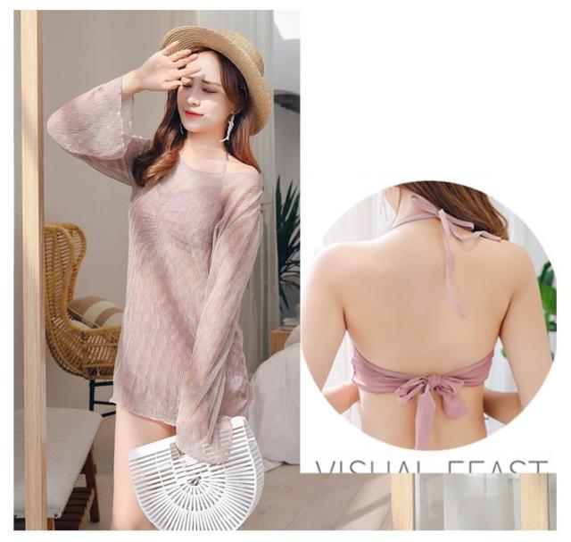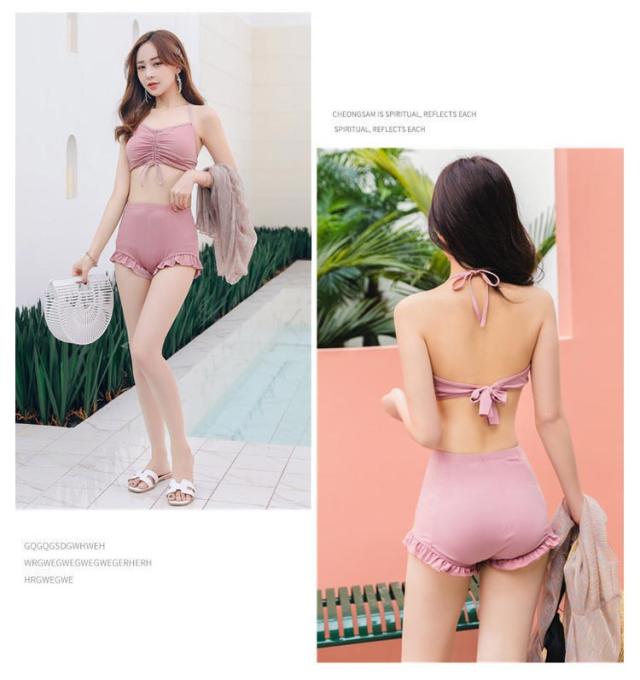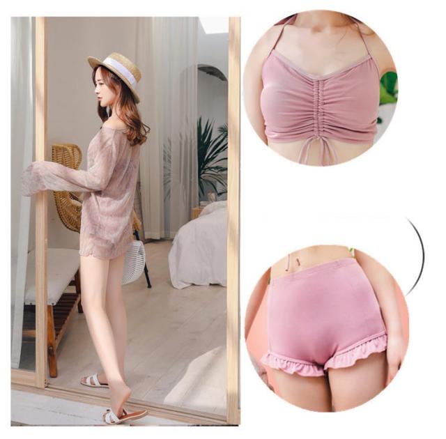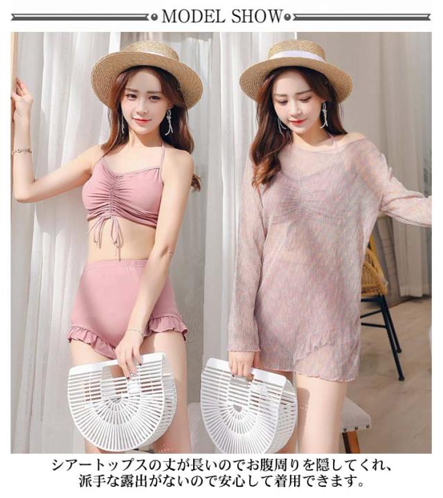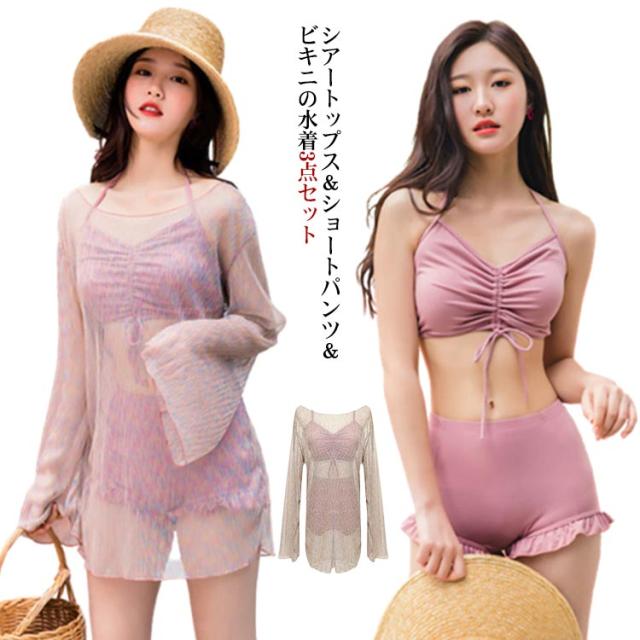 海水浴 シアートップス レディース 3点セット バンドゥ ハイウエスト ショートパンツ 大人 ラッシュガード 太もも 水着 体型カバー 二の腕カバー 露出控えめ お尻 フリル カバーアップ 女性 タンキニ 水着 海 リゾート ビーチ ビキニ