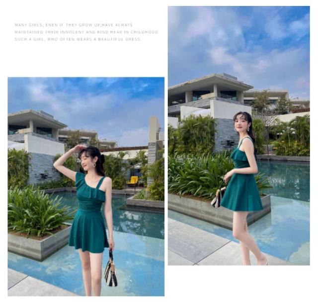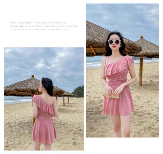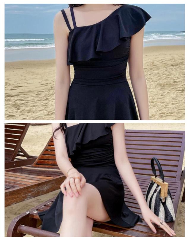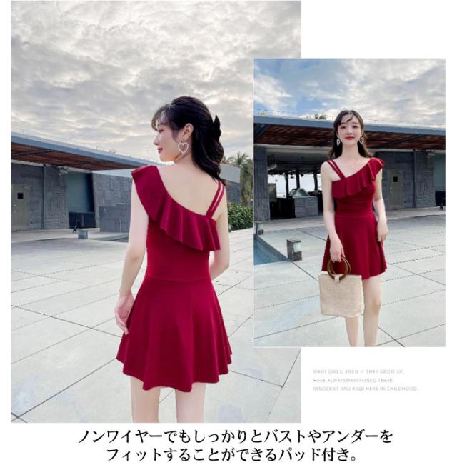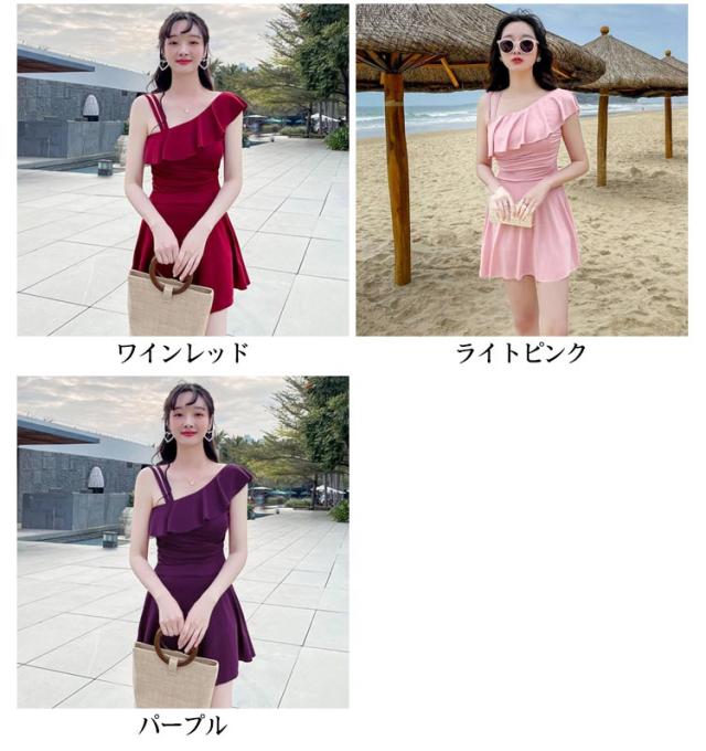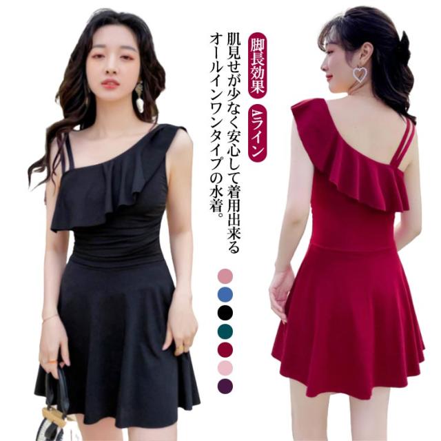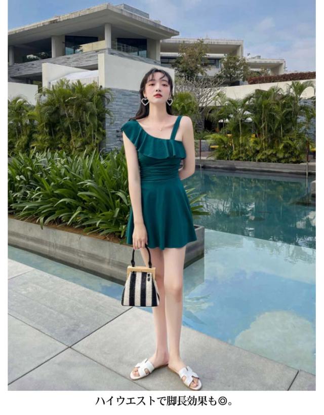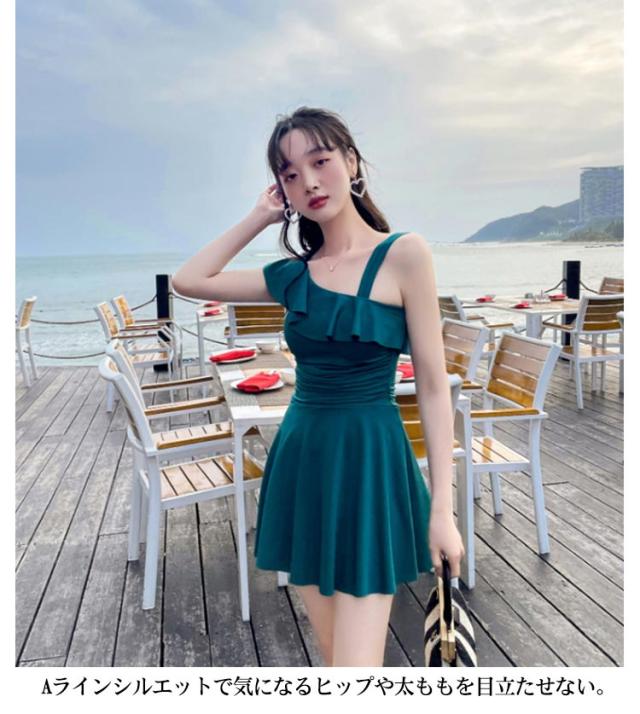 水着 肩フリル ワンショルダー オールインワン 女性 レディース 肩出し フレアワンピ スイムウェア 体型カバー Aライン 太もも エレガント フェミニン ダブルストラップ お腹 ワンピース カバーアップ 露出控えめ ハイウエスト 脚長効果 お尻