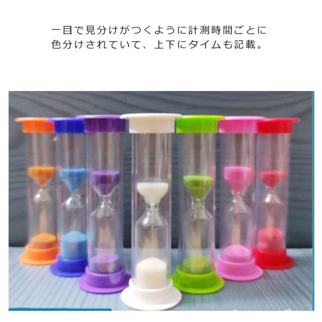| カラフルな七色セットがとてもキュートな砂時計。 一目で見分けがつくように計測時間ごとに色分けされていて、上下にタイムも記載。 歯ブラシ用に使ったり、コーヒー蒸らし時間に使ったりと、多くの場面で活躍しています。 特に筋トレ・ストレッチの時に1分タイマーが重宝しています。 カラフルで可愛い!目的無くとも逆さまにして、ただただ砂が落ちるのを見るのも楽しいです。 | |