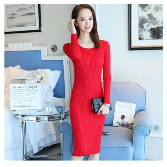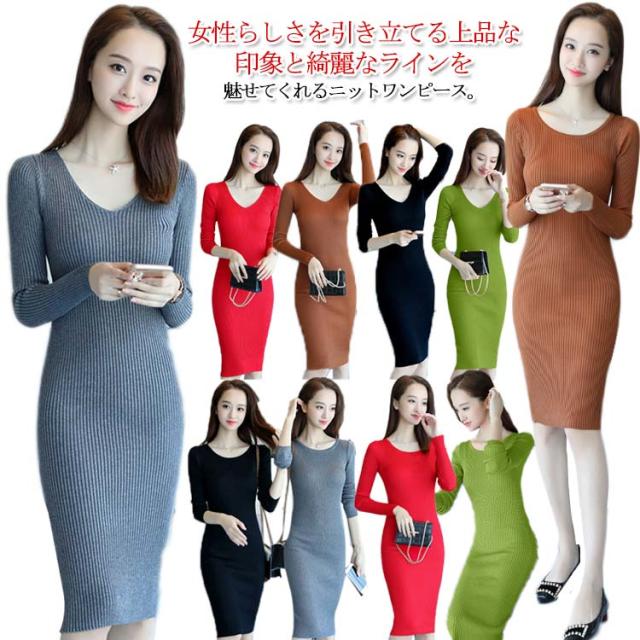 ニットワンピース レディース Vネック タイトワンピース クルーネック リブ仕様 長袖 膝丈 秋冬 着痩せ キレイめ デート 女子会 通勤 二次会 パーディー カジュアル