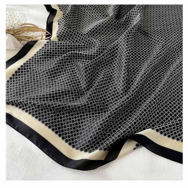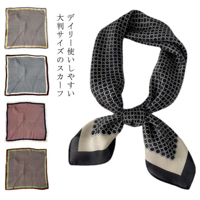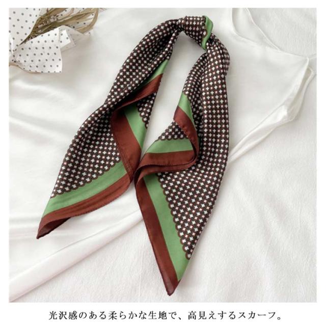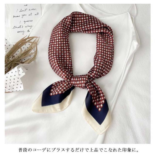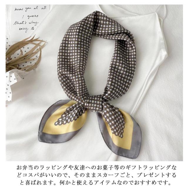| デイリー使いしやすい大判サイズのスカーフ 光沢感のある柔らかな生地で、高見えするスカーフ。 普段のコーデにプラスするだけで上品でこなれた印象に。 首元やバッグ、ヘアアクセサリーとしてなど様々なアレンジが楽しめます。 お弁当のラッピングや友達へのお菓子等のギフトラッピングなどコスパがいいので、そのままスカーフごと、プレゼントすると喜ばれます。何かと使えるアイテムなのでおすすめです。 ◇コーディネート◇ シンプルコーデとの相性抜群な、巻くだけでこなれ感たっぷりなスタイルを演出できるアイテム。 ヘアアクセサリーやバッグアクセサリーとしてなど幅広いアイテムとのアレンジが楽しめます。 | |
