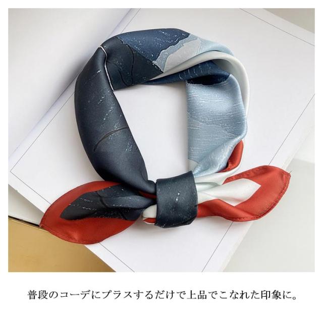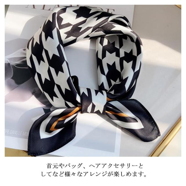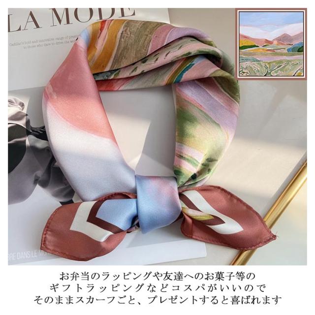 | デイリー使いしやすい大判サイズのスカーフ 光沢感のある柔らかな生地で、高見えするスカーフ。 普段のコーデにプラスするだけで上品でこなれた印象に。 首元やバッグ、ヘアアクセサリーとしてなど様々なアレンジが楽しめます。 お弁当のラッピングや友達へのお菓子等のギフトラッピングなどコスパがいいので、そのままスカーフごと、プレゼントすると喜ばれます。何かと使えるアイテムなのでおすすめです。 ◇コーディネート◇ シンプルコーデとの相性抜群な、巻くだけでこなれ感たっぷりなスタイルを演出できるアイテム。 ヘアアクセサリーやバッグアクセサリーとしてなど幅広いアイテムとのアレンジが楽しめます。 | |