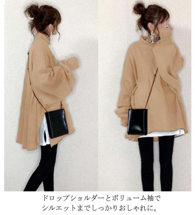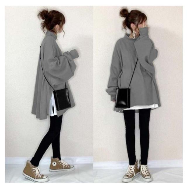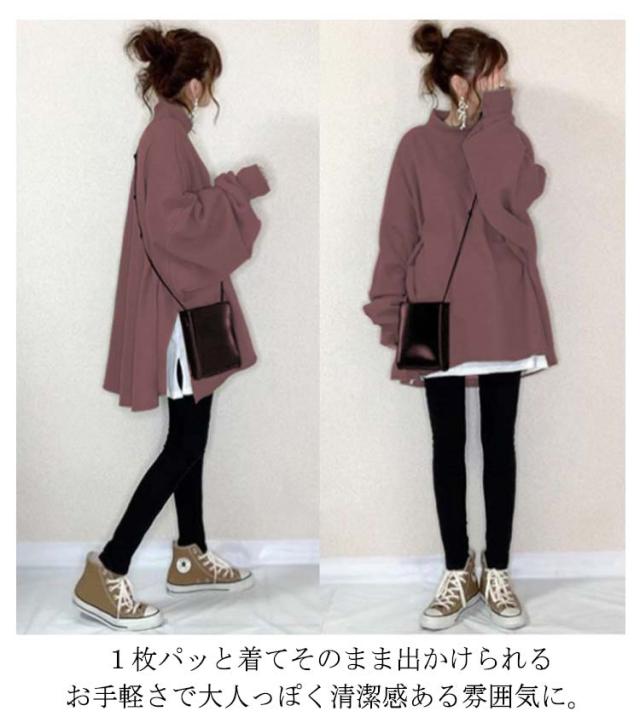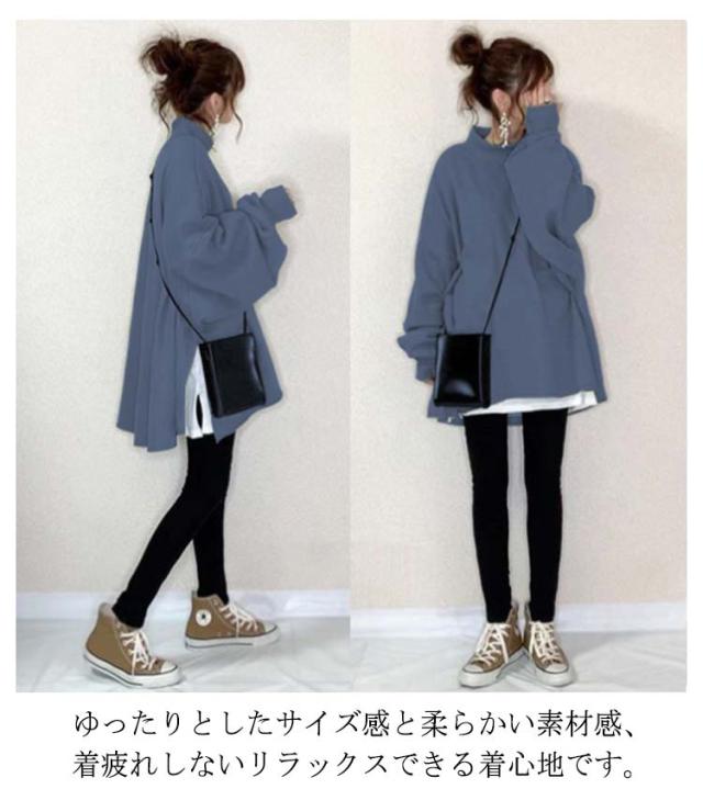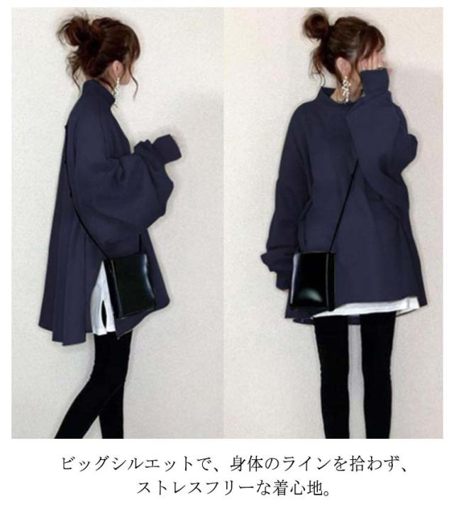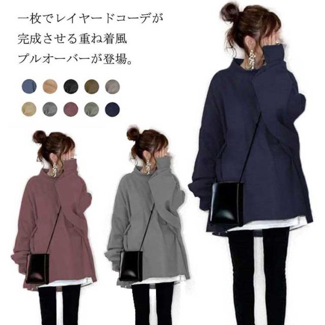 全10色 パーカー レディース トップス トレーナー スウェット プルオーバー ハイネック 重ね着風 サイドスリット 長袖 裾フレア ボリューム袖 ドロップショルダー ゆったり チュニック トップス カットソー シンプル 無地 ビッグシルエット