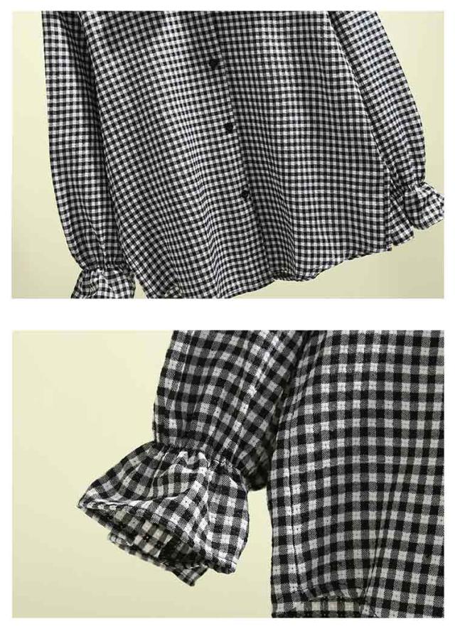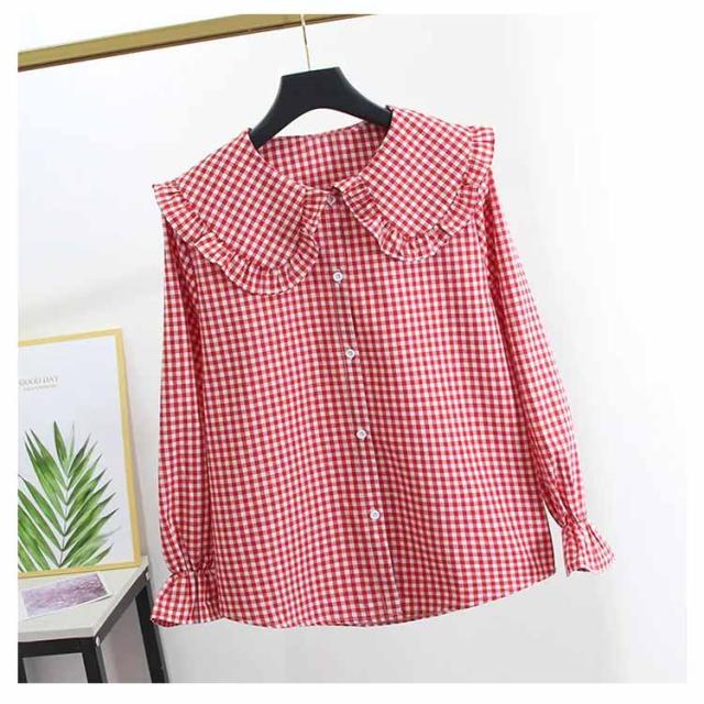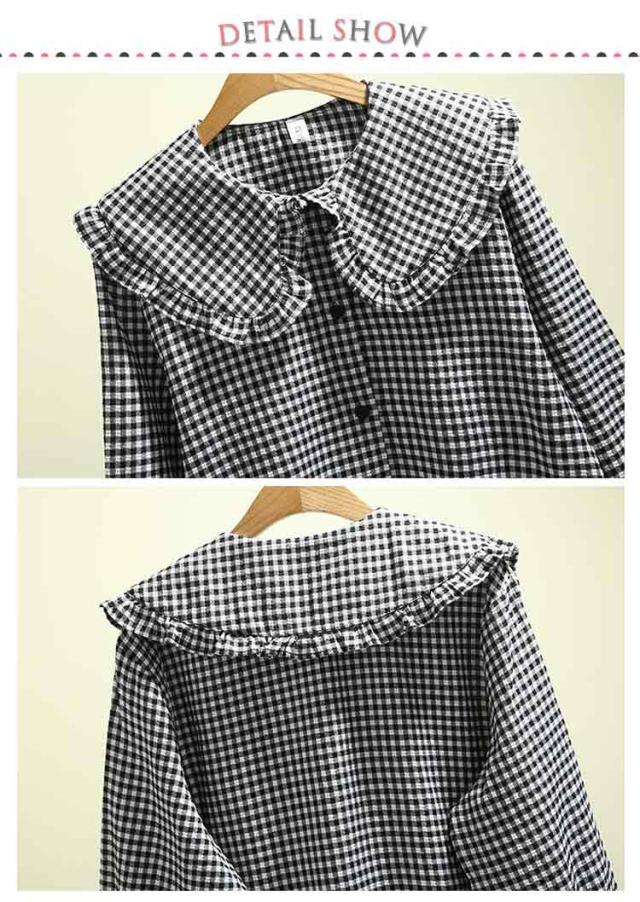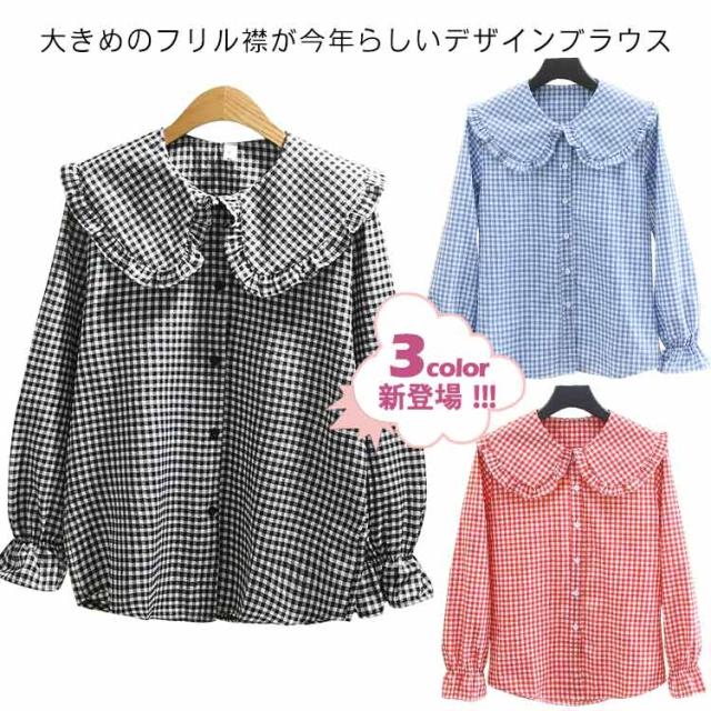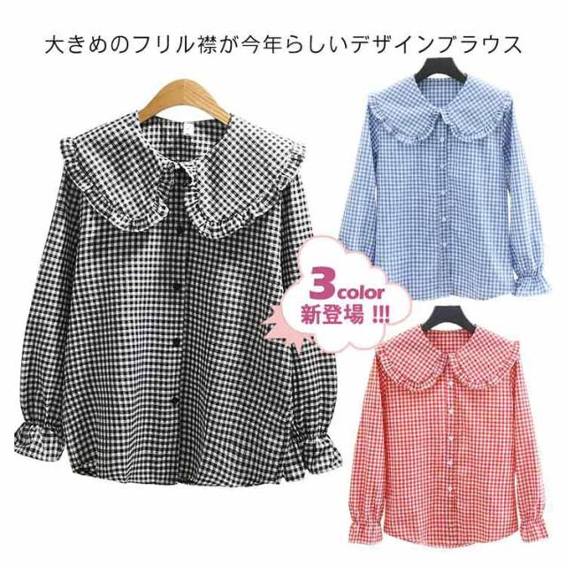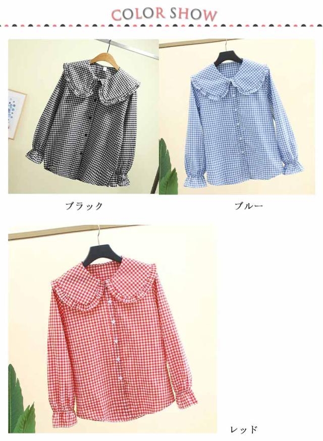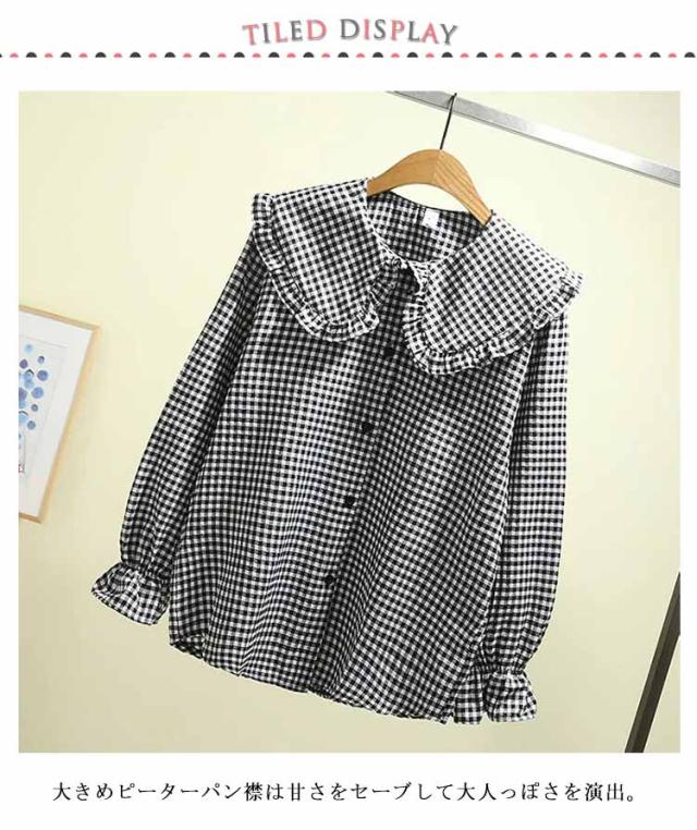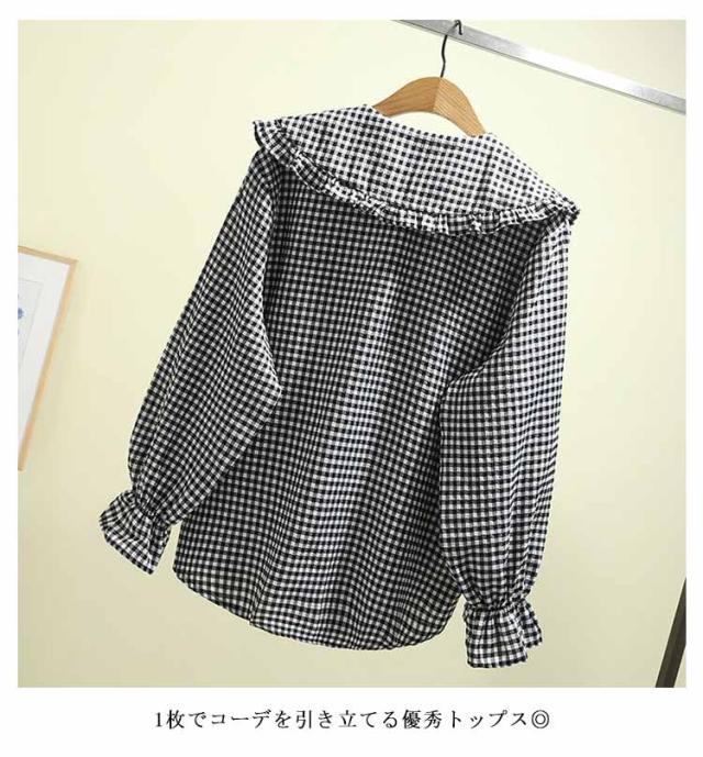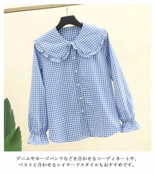 シャツ レディース フリル襟 ピーターパン襟 ブラウス チェック柄 コットン 綿 ビッグカラー フリルカラー セーラーカラー おしゃれ 長袖シャツ トップス 袖フリル かわいい レイヤード 重ね着 ゆったり 可愛い カジュアル 通勤 通学 春 夏 秋 冬 送料無料