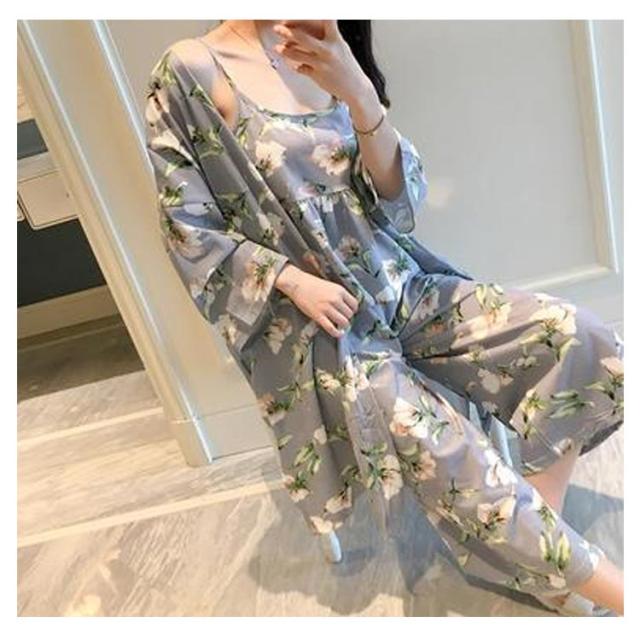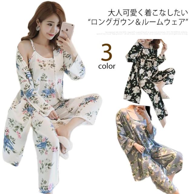 ルームウェア レディース ロングガウン キャミソール パンツ 上下セット 3点セット おしゃれ 可愛い 長袖 トップス 女の子 春夏 シンプル セクシー キュート パジャマ 可愛い 寝間着 部屋着 大きいサイズ 伸縮性 女性用 花柄 M L XL 送料無料