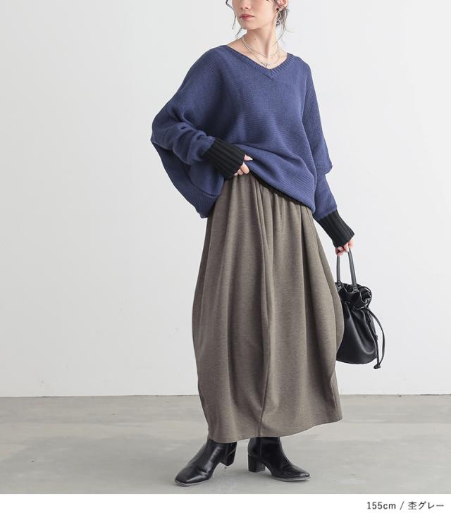 『変形コクーンカットソースカート』【メール便不可】【20】[ロングスカート レディース 春秋冬 ボトムス カットソー 変形 コクーン ミモレ丈 ウエストゴム 落ち感 ポケット 切り替え フリーサイズ]