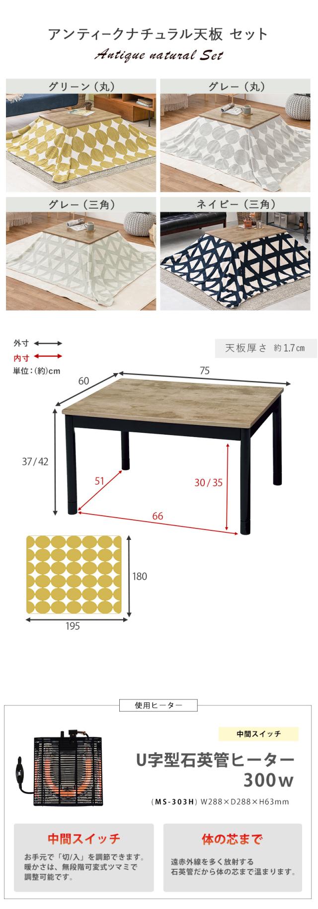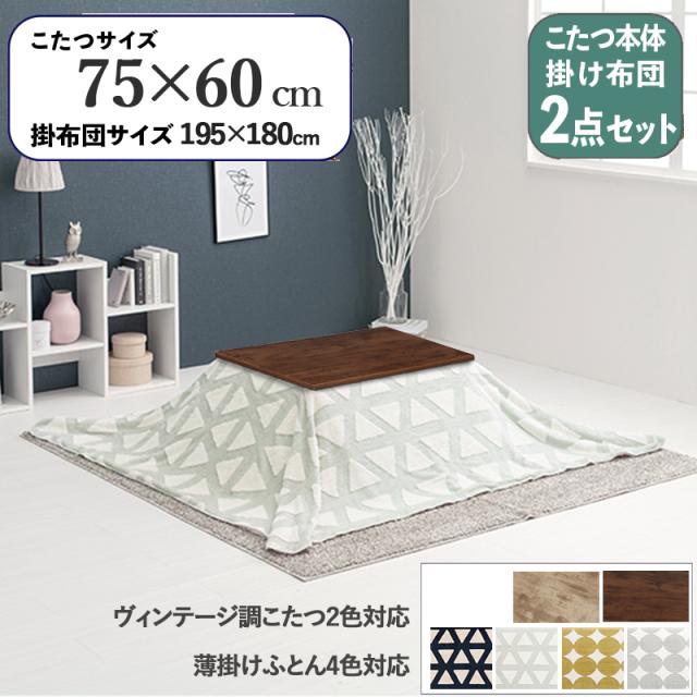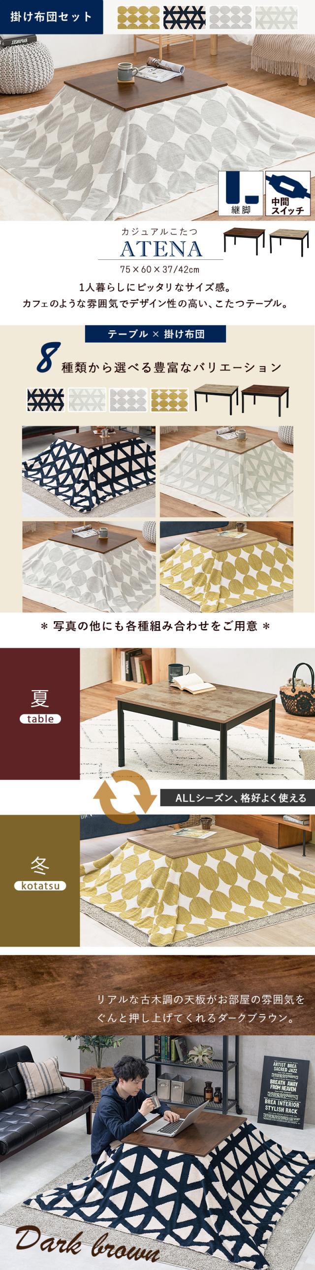 【2点セット】こたつ+薄掛けこたつふとんセット 北欧柄 グレー 三角柄 長方形 ダークブラウン テーブル 75×60cm 古木調シート 継脚 石英管ヒーター カフェ風 ATENASLOW