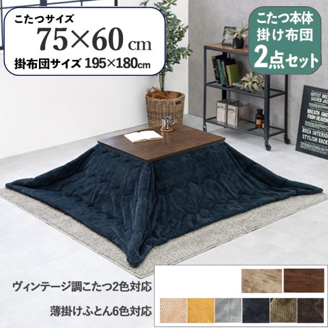 【2点セット】こたつ+薄掛けこたつふとんセット 無地柄 ネイビー 全6色 長方形 ダークブラウン テーブル 75×60cm 古木調シート 継脚 石英管ヒーター カフェ風 ATENAPIQUE
