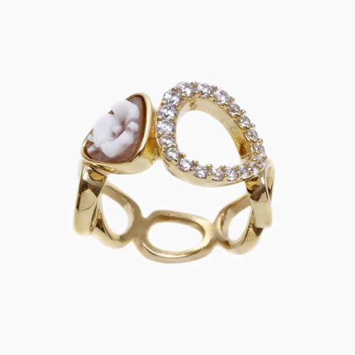 キュービックジルコニア取巻きの大胆でおしゃれなデザインと可愛いプチフラワーのシェルカメオとのバランスが格別な雰囲気を演出しています。