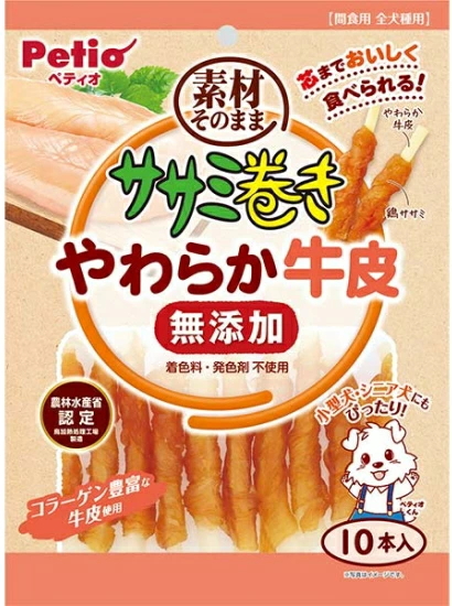 やわらか食感で食べやすい牛皮を旨味たっぷりなササミで巻きました。気になる着色料・発色剤不使用で、素材そのままがうれしいササミ巻きです。農林水産省認定鳥加熱処理工場製造。