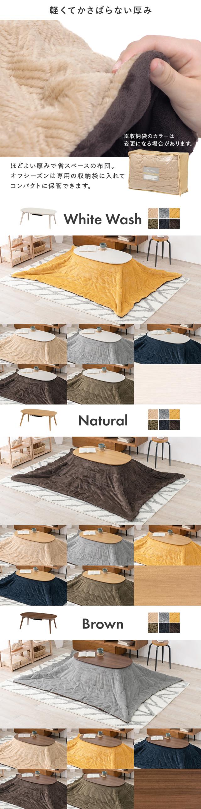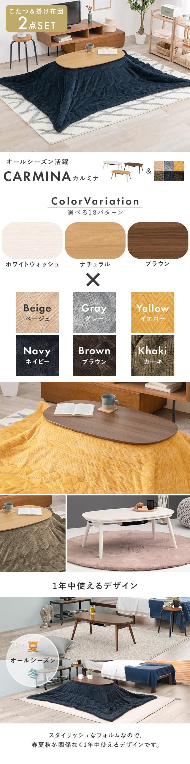 【2点セット】こたつ+薄掛けこたつふとんセット 無地柄 カーキ 全6色 楕円形 ブラウン テーブル 折れ脚 折りたたみ コンパクト ちいさめ 木目調 石英管ヒーター CAMINAPIQUE