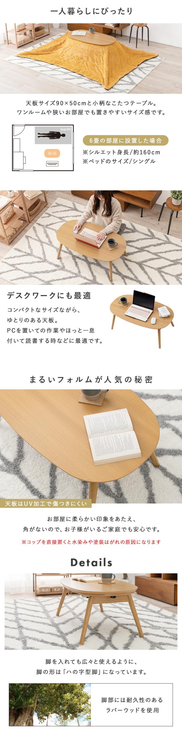 こたつに見えないおしゃれな楕円形。木目調の天板やハの字型の脚などおしゃれなフォルム。