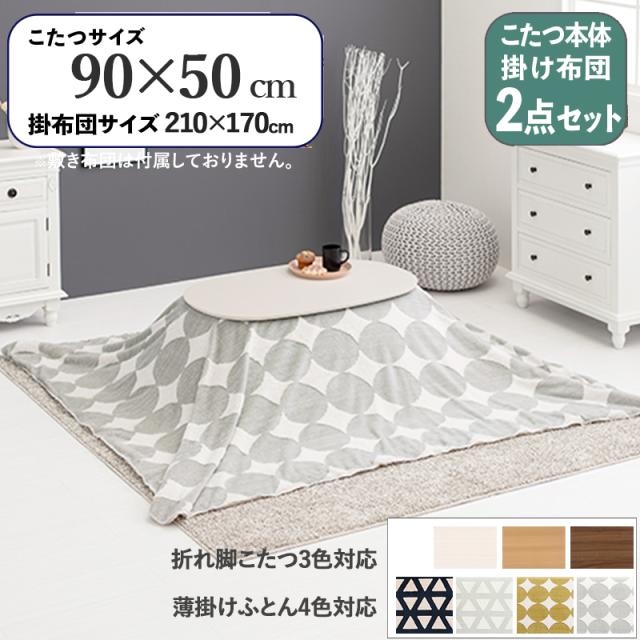 【2点セット】こたつ+薄掛けこたつふとんセット 北欧柄 グレー 丸柄 楕円形 ホワイト テーブル 折れ脚 折りたたみ コンパクト ちいさめ 木目調 石英管ヒーター CAMINASLOW
