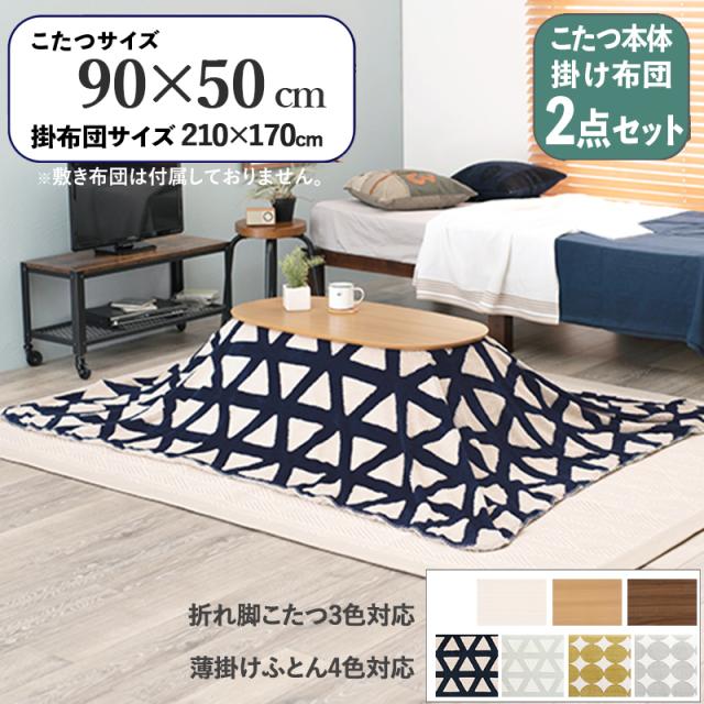 【2点セット】こたつ+薄掛けこたつふとんセット 北欧柄 ネイビー 三角柄 楕円形 ナチュラル テーブル 折れ脚 折りたたみ コンパクト ちいさめ 木目調 石英管ヒーター CAMINASLOW