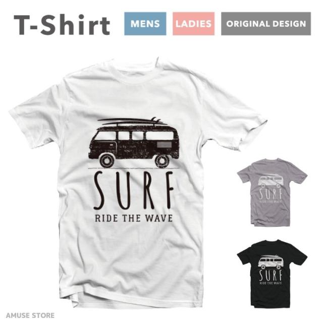 Tシャツ レディース 半袖 おしゃれ プリント ブラック ホワイト グレー SURF RIDE THE WAVE 夏 SUMMER 車 CAR 波 砂浜