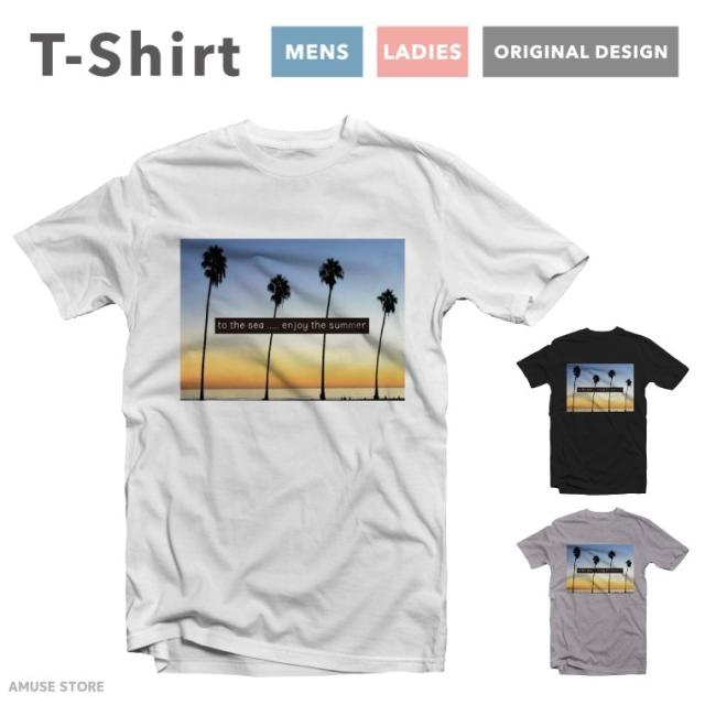 Tシャツ レディース 半袖 おしゃれ プリント ブラック ホワイト グレー To The sea enjoy The summer beach ヤシの木 夕焼け