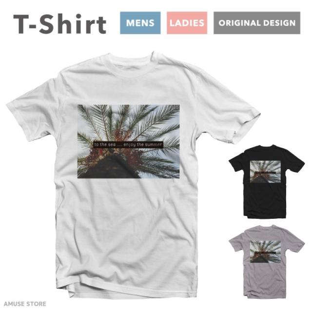 Tシャツ レディース 半袖 おしゃれ プリント ブラック ホワイト グレー To The sea enjoy The summer beach ヤシの木 夕焼け