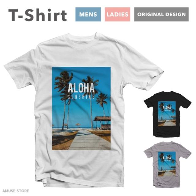 Tシャツ レディース 半袖 おしゃれ プリント ブラック ホワイト グレー ALOHA SUNSHINE ヤシの木 アロハ summer beach 海 夏