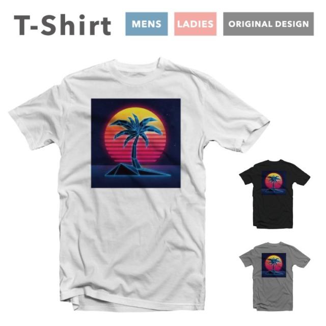 Tシャツ レディース 半袖 おしゃれ プリント ブラック ホワイト グレー ヤシの木 ハワイアン Hawaiian BEACH ビーチ 夕焼け