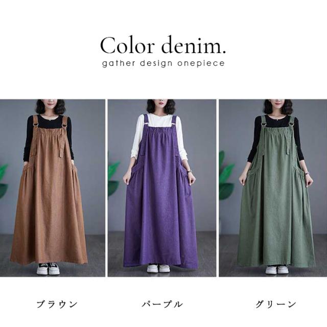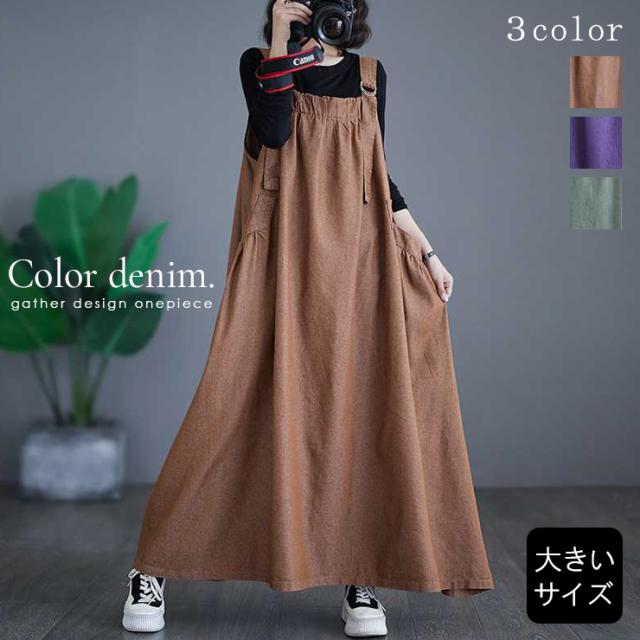 大きいサイズ レディース ジャンパースカート マキシ丈 カラーデニム サロペットスカート 春 夏 秋 冬 (135522)