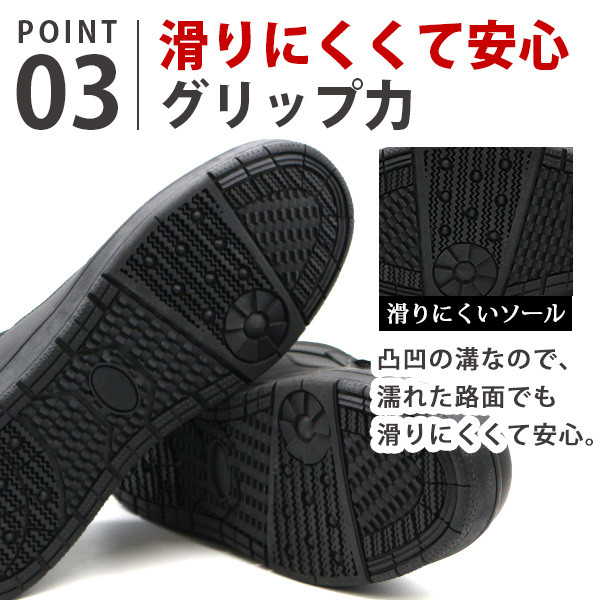 アウトソールは凸凹の溝になっており、濡れた路面でも安心です。