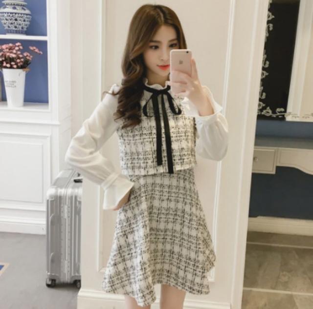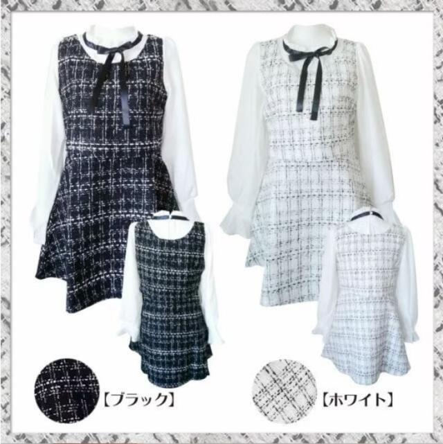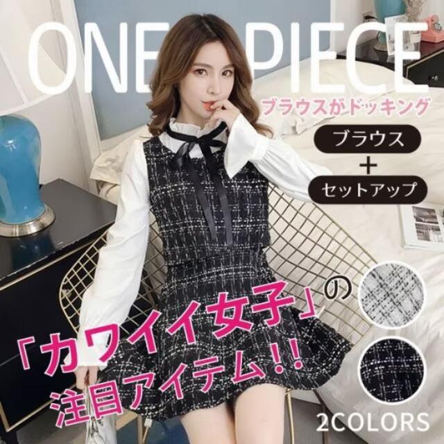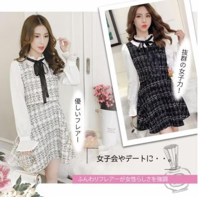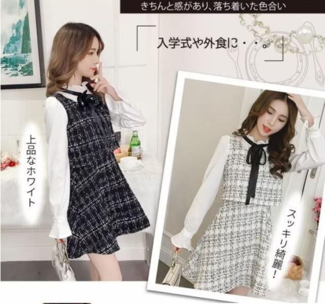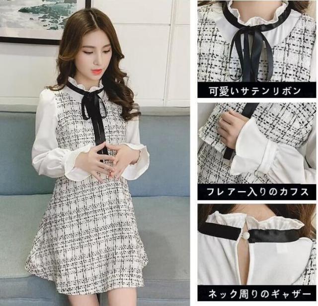 ワンピース レディース 長袖 重ね着 ブラウス シャツワンピ ブラウスコンビツイード 可愛い 秋冬