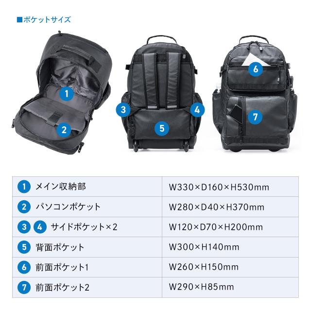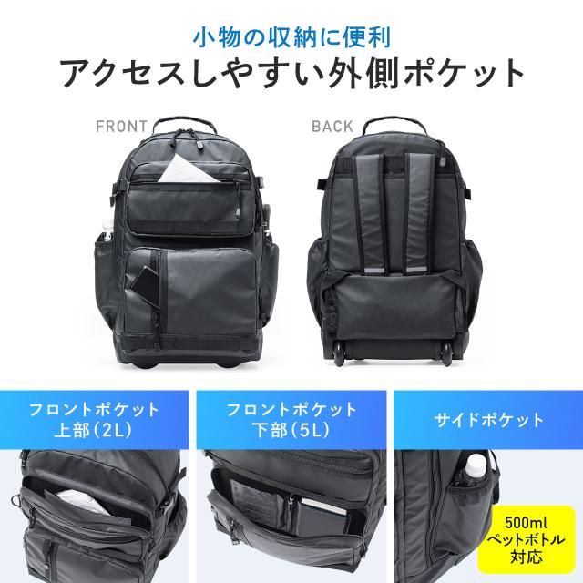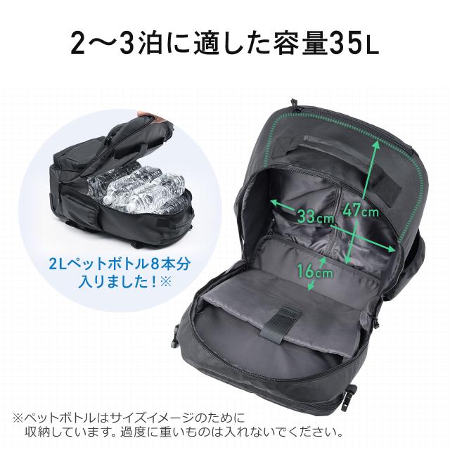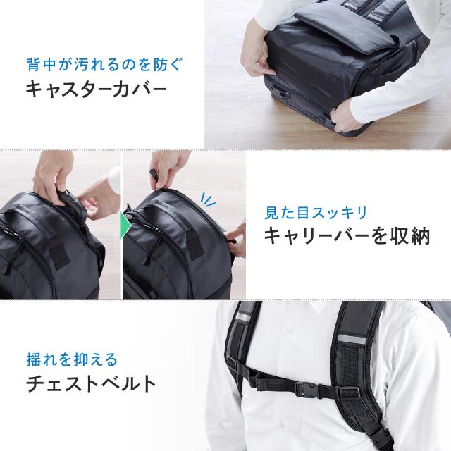 ⇒ご購入の前にご確認下さいビジネスシーンで使いやすいキャリーリュック。リュックでもキャリーでも使える2WAYビジネスキャリー。水を通さないPUコーティング加工によって耐水性が高い。容量35リットルで豊富なポケットを採用。ブラック。【WEB限定商品】