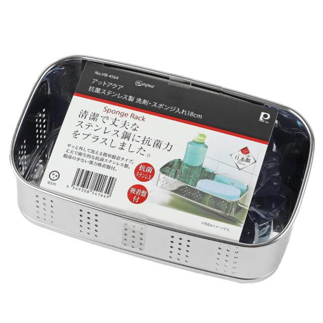 スポンジラック アットアクア 抗菌ステンレス製洗剤スポンジ入れ18cm ( ステンレス 吸盤 日本製 スポンジ入れ スポンジホルダー スポンジ置き スポンジ収納 水切り スポンジ 入れ 置き 洗剤立て 洗剤置き 洗剤入れ たわし入れ )