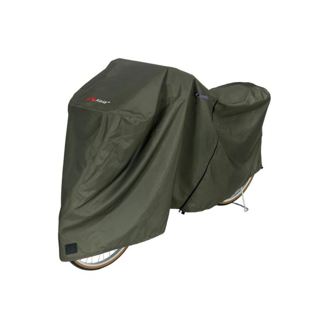前カゴ付きアシスト車対応!雨風から自転車を守る、サイクルカバー(レギュラーサイズ)が新登場。【丈夫で長持ち】・300デニールの厚手生地を使用しており、破れにくく耐久性ばっちり。表面ははっ水、裏面はPUコーティング加工を施した防水仕様。水の侵入を防ぐ止水テープ付き。【レギュラーサイズ】リヤにカゴや子乗せがついていない、20型〜27型(全長190cmまで)のアシスト車に対応。(※自転車のサイズ、形状によりかぶり込み具合が異なります。)【装着もバッテリー交換もスムーズ】ファスナーを開けて被せると、素早く装着!センターにファスナーが付いているから、カバーをかけた状態でもバッテリーの交換がラクラク。【ぴったりフィット】フォルムがキレイな3D立体縫製。背面裾のドローコードを絞ると、ボディにしっかりフィット。【防犯面も安心】フロントにロック対応の補強穴付き。カバーをしたままロックできて、盗難防止にも効果的。【風飛び防止バックル】裾部分のバックルベルトで固定すれば、雨風が強い日も大丈夫。【お手入れが簡単】水滴をサッと払って、汚れも拭き取ることが可能。物干しポールに干せる、スナップボタン式の乾燥ベルトを装備。【おしゃれなカラー】ユニセックス仕様のカーキカラー。スタイリッシュな雰囲気を演出。