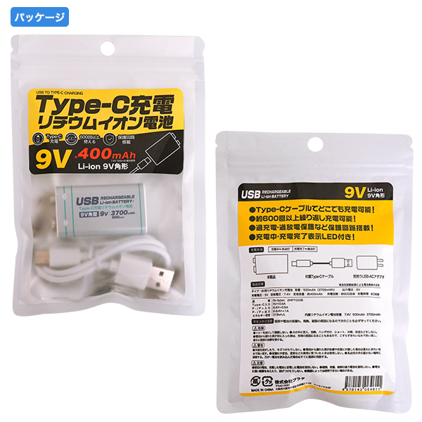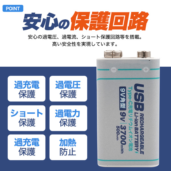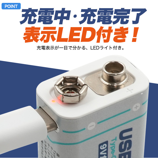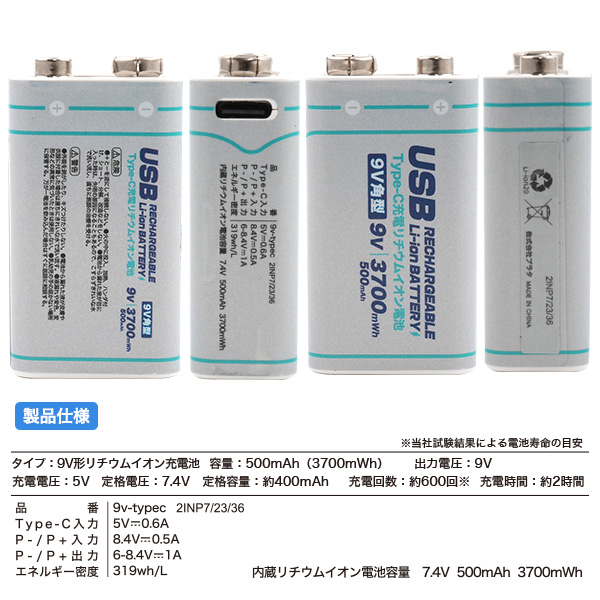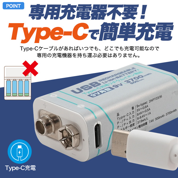 9V形 充電池 Type-Cケーブルで直接充電 リチウムイオン電池 9V型 電池 ケーブル付き 専用充電器不要 600回以上繰り返し充電 エコ 経済的 充電池 送料無料 電池 予備 ポイント消化 家電 でんち 006P型乾電池型 おもちゃ トランシーバー ラジコン