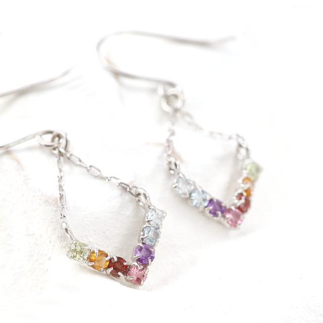 | スタッフより | 7種類の宝石がゆれるフックピアスです。 古来より、7色のものを身に付けると厄を払い、幸運を呼ぶと云われています。 7つの宝石をスタイリッシュなVの字デザインにセットしたピアスは、自分用のお守りジュエリーや愛する彼女、妻(奥様)への記念日の贈り物、娘さんやお友達への誕生日プレゼントにもオススメです。 ・皆様の笑顔があふれますよう真心を込め丁寧にご準備させて頂きます。 (ご不明な点はお気軽にお問合せ下さい。0120-755-888(平日9時〜18時)) |