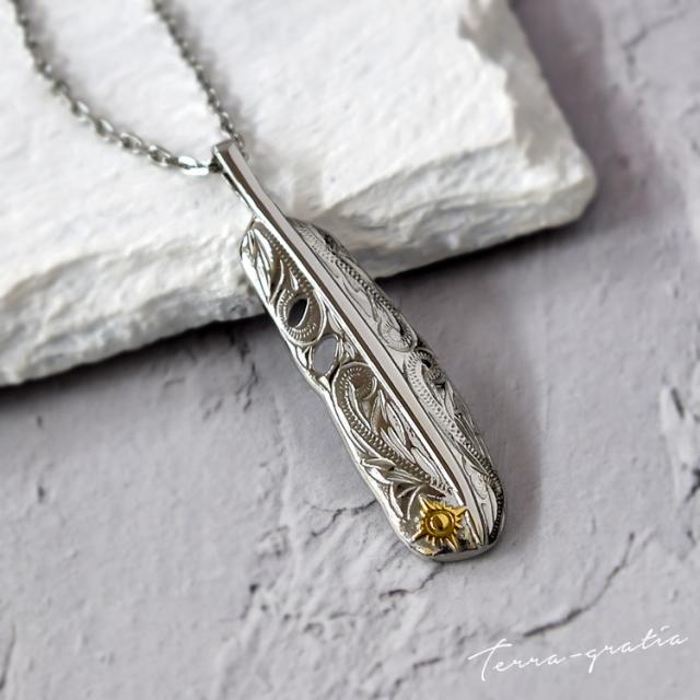 フェザー(羽)チーフに繊細なハワイアン柄を施したネックレス。【スティールシルバーカラー】