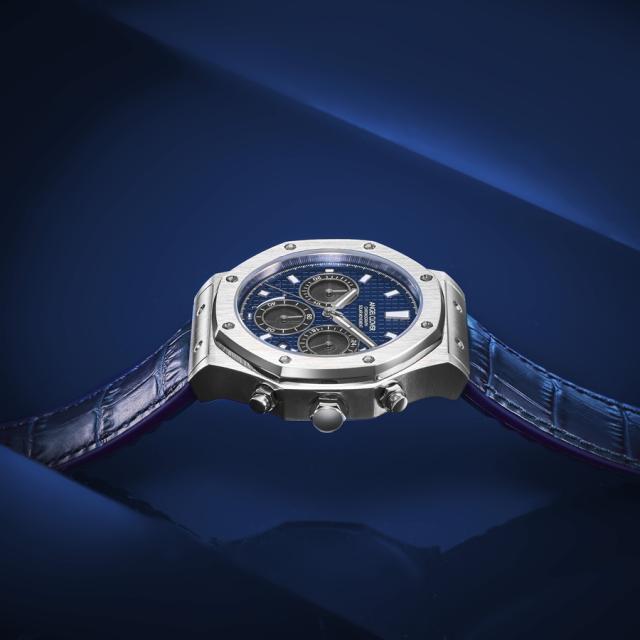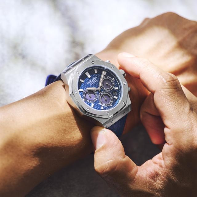八角形のケースや揃えられたベゼルの鋲など、タフでエッジィかつ高級感のあるデザインが特長です。