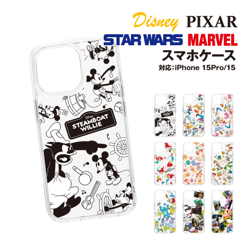 ディズニーキャラクター、ピクサーキャラクター、STAR WARS、MARVELデザインのiPhone 15用 クリアハイブリッドケースです。
