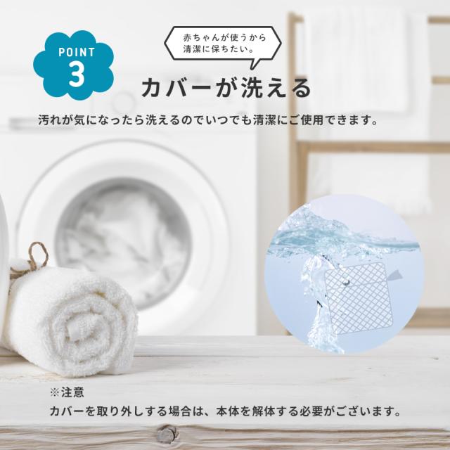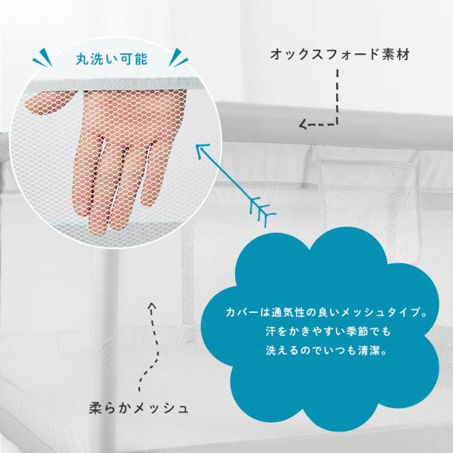 ・カバーは通気性の良いメッシュタイプ。汗をかきやすい季節でも蒸れず、赤ちゃんがぶつかってしまっても柔らかいので安心です。