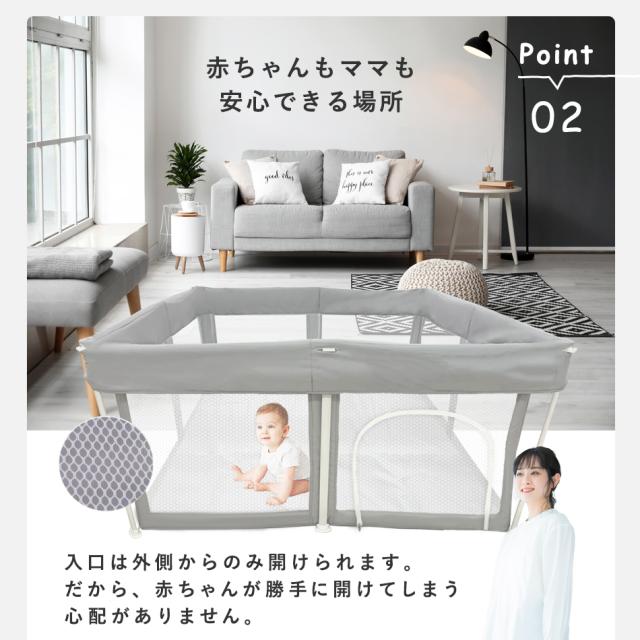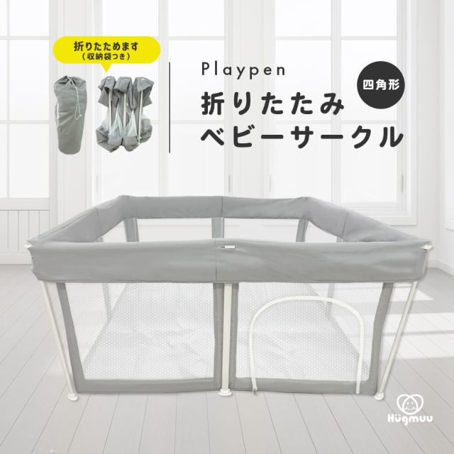ベビーサークル 折りたたみ マット付き 扉付き メッシュ Hugmuu ハグムー ベビー 簡単 洗える 洗えてたためる 省スペース 持ち運び ファスナー 屋内 屋外 コンパクト 折り畳み グレー シンプル リビング 寝室 ポータブル ずれない 四角形