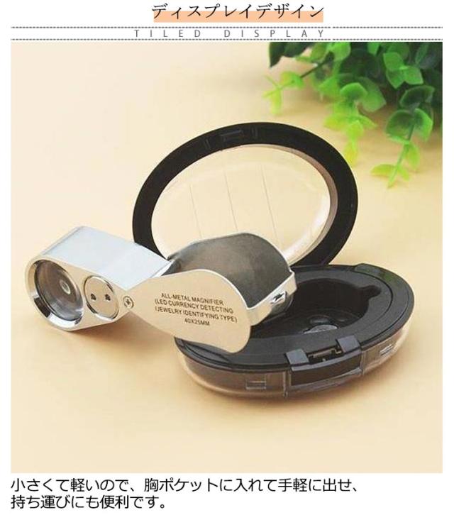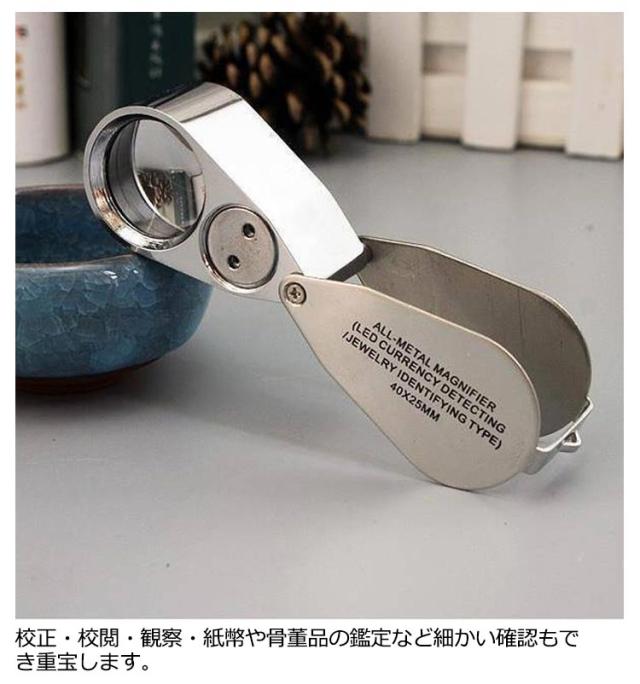 | 倍率40倍!ジュエリー鑑定・校閲作業など小型ルーペ! !LED&ブラックライト付きで暗所でもハッキリ見えます! 小さくて軽いので、胸ポケットに入れて手軽に出せ、持ち運びにも便利です。 折り畳める・軽量・コンパクトでプレゼントにもオススメです♪ 校正・校閲・観察・紙幣や骨董品の鑑定など細かい確認もでき重宝します。 | |