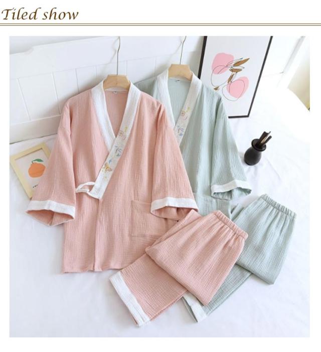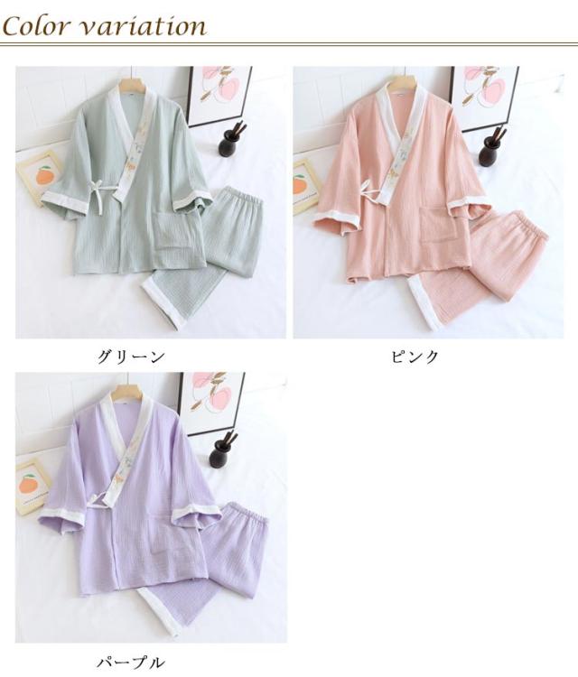 ガーゼパジャマ ねまき レディース ルームウェア 和風 甚平 浴衣 二重 ガーゼ 前開き 五分袖 通気性 吸汗吸湿 綿 コットン 女性 寝間着 部屋着 作務衣 お風呂 旅館 浴衣 ホテル 上下セット 春 夏 秋