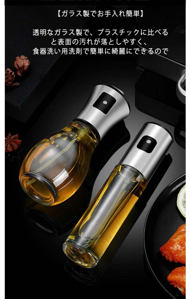 | スプレーになるので、油を均一的に霧吹くことが可能です。 過度な油分摂取を抑えることができますので、油分を気にする場合やダイエットには効果的です。 【色んなシーンで大人気】キャノーラ油、大豆油、サラダ油、オリーブオイルなど市販食用油はほとんど全種類適用します。 キッチン/台所/バーなど幅広い場合に適用します。そして、キャンプ、BBQなど戸外で持ち運びたい時も、お気軽に持ち歩けますよ。便利なオイルスプレーボトルです。 【使い勝手が良い】スプレーボトルにはプッシュするだけでミストを微細に分散させて、スムーズにスプレー効果も得られます。更に、加圧式霧吹きではなく、何度もプッシュする手間が省けるため、圧倒的に効率がアップします。細かいスプレー効果になるので、油をムラなく吹き付けることが可能です。 【ガラス製でお手入れ簡単】透明なガラス製で、プラスチックに比べると表面の汚れが落としやすく、食器洗い用洗剤で簡単に綺麗にできるので、お手入れがしやすいのも。耐熱ガラスですので、うっかり火のそばに置いてしまっても安心です。 | |