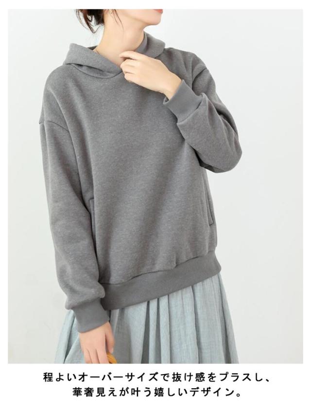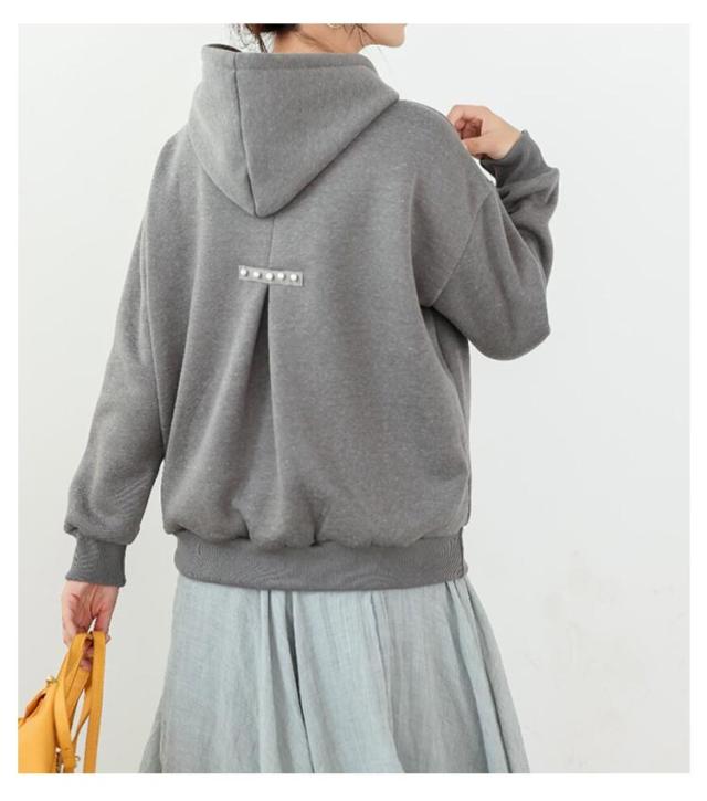 | バックスタイル上品魅せ、バックパール付きパーカーの登場です! 大きめパールを背中にあしらい上品フェミニンに。 程よいオーバーサイズで抜け感をプラスし、華奢見えが叶う嬉しいデザイン。 ゆったりとしたボックスシルエットで、締め付け感もなく着心地も楽ちん。しっかりしたフードで小顔効果と今風な着こなしが手に入る優れモノ。これからの時期に大活躍する使いやすい推しアイテムです。 お尻が半分隠れる丈で、気になるお腹やウエスト回りの体型カバーが叶うフード付きプルオーバーです。便利なポケットが付いているので、ちょっとした外出やお買い物には手ぶらコーデでお出かけできます。 フード付きのデザインは、旬の大人カジュアル感を一層引き立ててくれますね◎ バックタック入りで立体的な膨らみのあるシルエットにアクセントのパールがカジュアルながらもラグジュアリーな雰囲気を漂わせてくれます。 20代、30代、40代、50代と年齢問わず着ていただけ、着回し力もバツグンなので、毎日のお洋服選びの強い味方となる、おしゃれな1着です。 | |