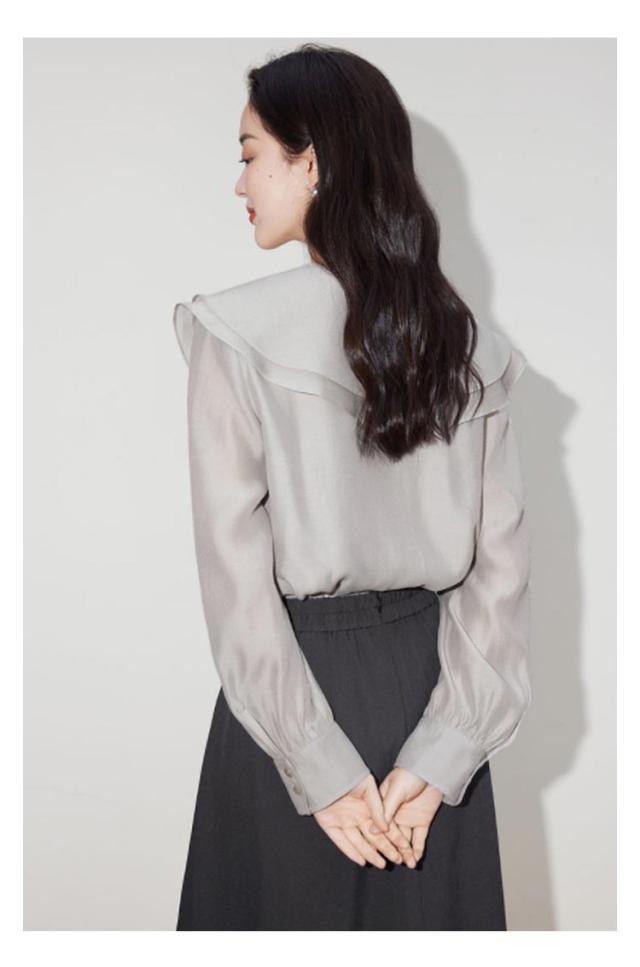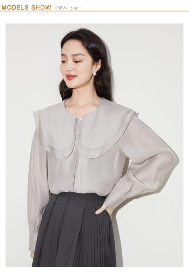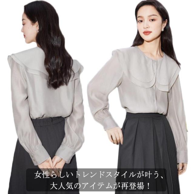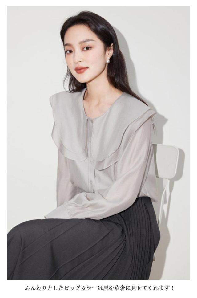 ビッグカラーブラウス フリルブラウス ボリューム袖 トップス シャツ レディース フリルカラーブラウス シアー 長袖 ケープ襟 キャンディスリーブ 送料無料 無地 春夏 フリル 透け感 シースルー ケープカラー オフィス 大人 上品